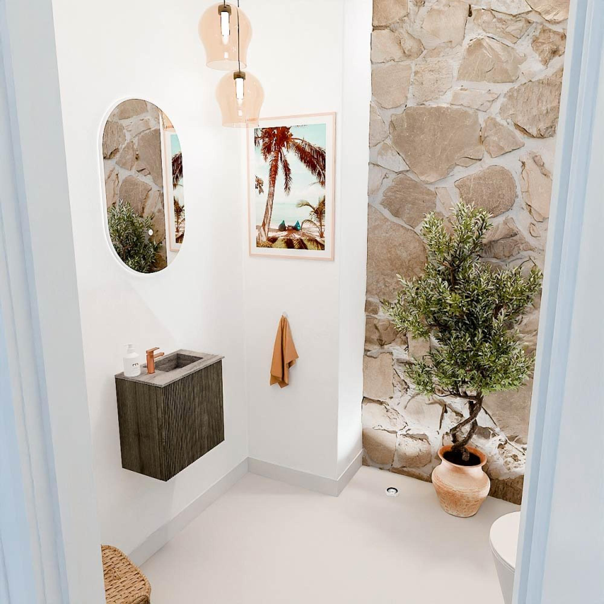 Het meubel valt direct op door zijn elegante uitstraling. De fronten zijn gemaakt van massief eikenhout, wat niet alleen een luxe gevoel geeft, maar ook een tijdloze charme toevoegt aan je badkamer. De verticale groeven in het design zorgen voor een subtiele, moderne touch die het geheel een verfijnde uitstraling geeft. De kleur Shadow versterkt dit effect met een diepe, natuurlijke tint die moeiteloos combineert met diverse interieurstijlen. Zo creëer je een badkamer die niet alleen functioneel is, maar ook echt indruk maakt op je gasten.