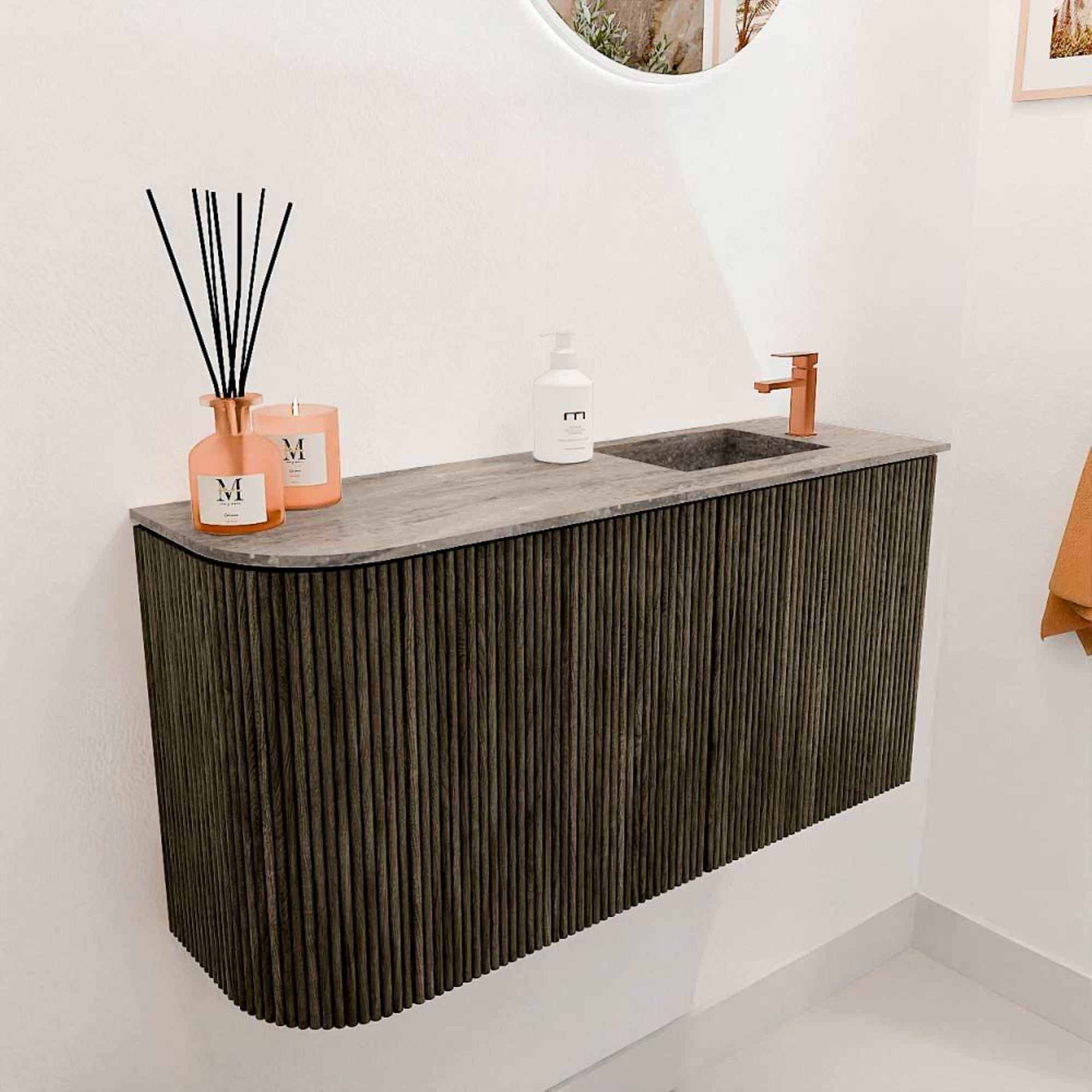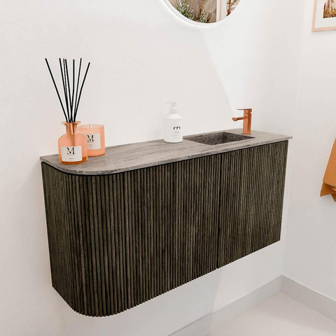 Het meubel valt direct op door zijn moderne en verfijnde uitstraling. De diepe Shadow-kleur geeft een luxe en tijdloze touch, terwijl de zachte ronding aan de linkerkant het geheel een speels en uniek karakter geeft. De wastafel in de kleur Oza sluit hier naadloos op aan met een natuurlijke, warme tint die rust uitstraalt. Zo creëer je een badkamer die niet alleen functioneel is, maar ook een echte eyecatcher vormt. Met dit stijlvolle meubel haal je een designstuk in huis dat moeiteloos past bij diverse interieurstijlen.