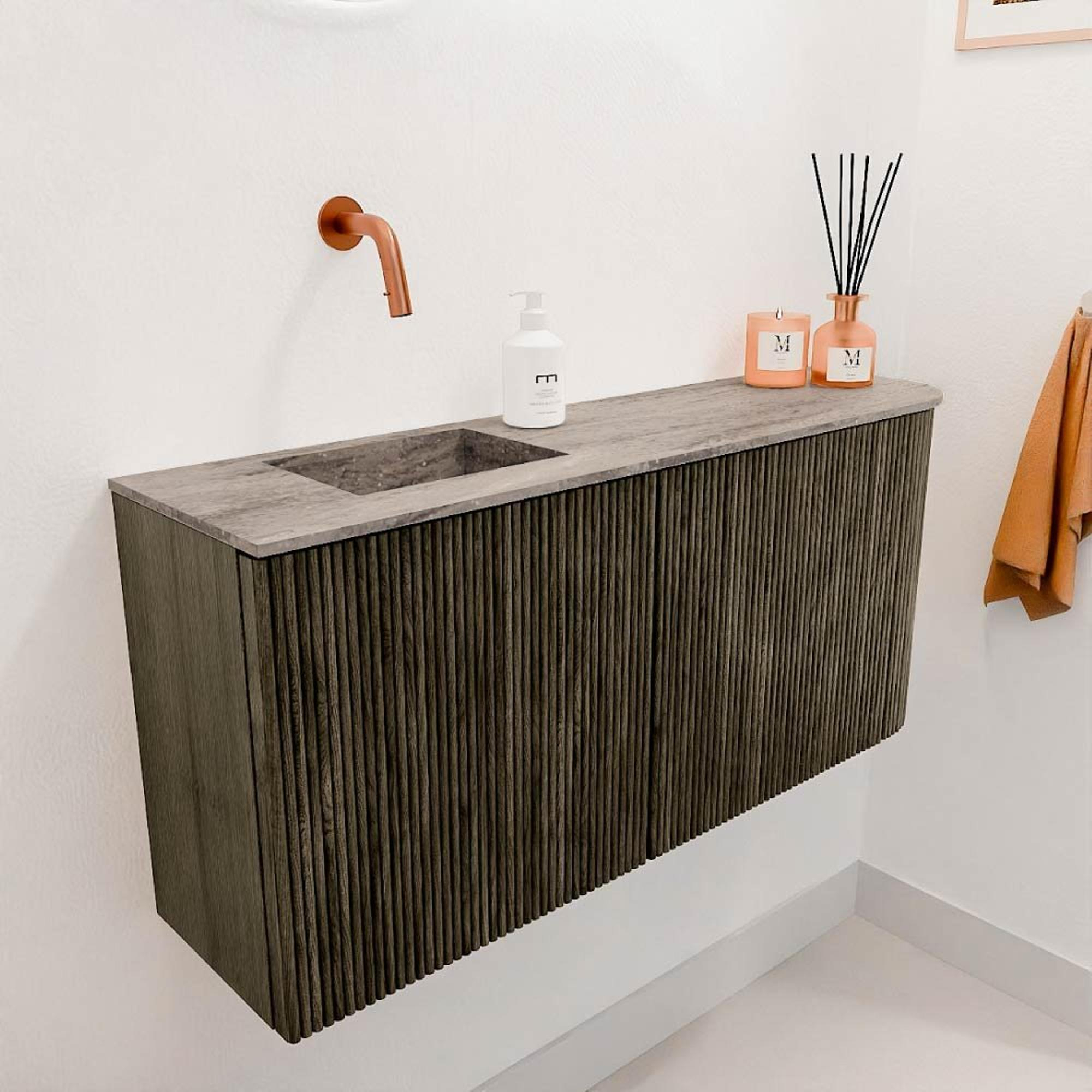 Het meubel combineert een natuurlijke houtlook met een moderne, donkere kleur die perfect aansluit bij diverse interieurstijlen. De massief eikenhouten fronten stralen kwaliteit en vakmanschap uit, terwijl de subtiele ronding aan de rechterzijde het geheel een uniek en speels karakter geeft. Dit zorgt ervoor dat jouw badkamer er niet alleen mooi uitziet, maar ook een warme en uitnodigende sfeer krijgt. Door de tijdloze uitstraling past dit meubel moeiteloos bij zowel klassieke als moderne badkamers, waardoor je jarenlang plezier hebt van je aankoop.