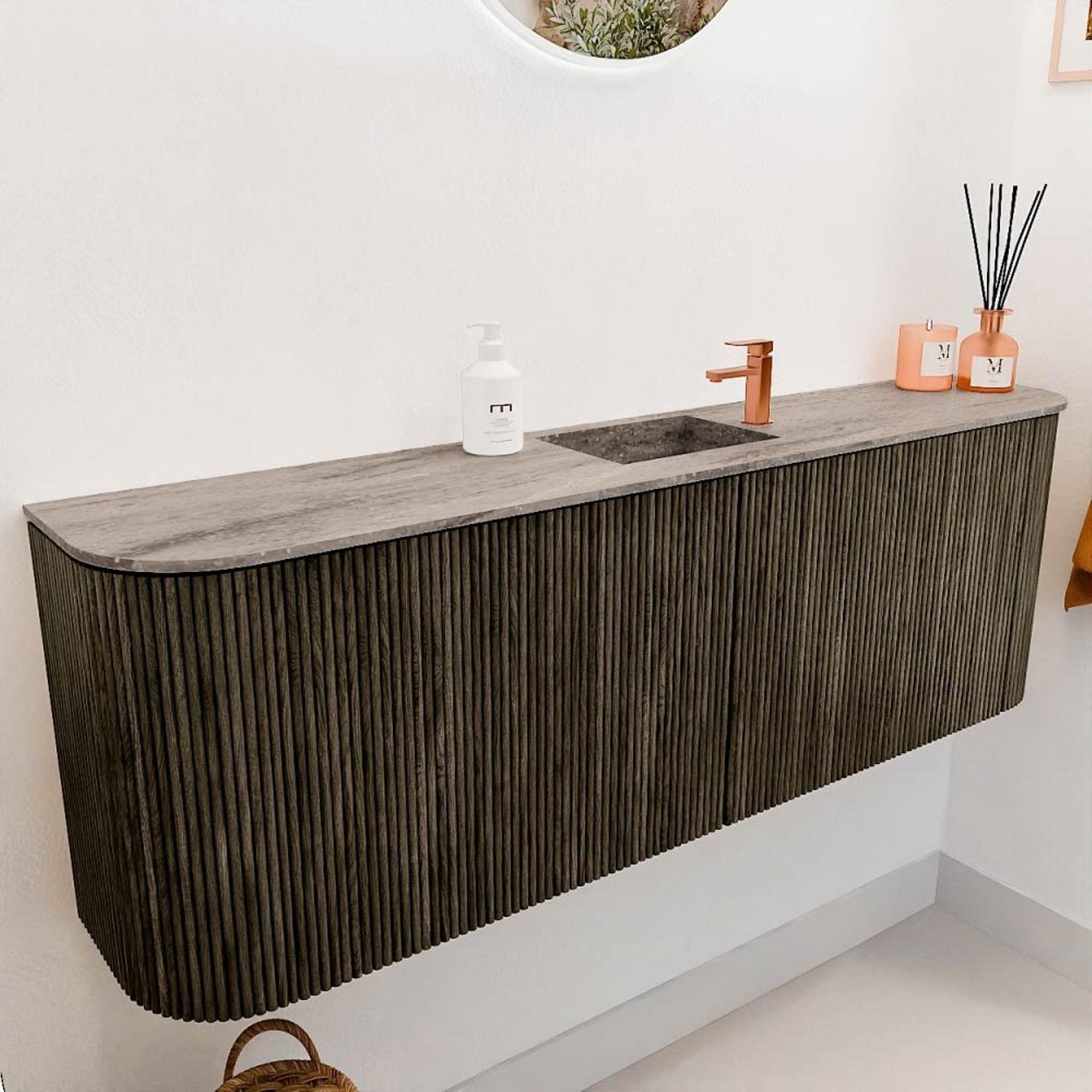Met dit prachtige meubel geef je jouw badkamer of gastentoilet direct een stijlvolle en moderne uitstraling. Het compacte ontwerp met een breedte van 123,2 cm past perfect in kleinere ruimtes, zonder in te leveren op opbergruimte of comfort. Dankzij de subtiele rondingen aan de linker- en rechterzijde krijgt het meubel een zachte, uitnodigende uitstraling die elke badkamer een warme sfeer geeft. De combinatie van de diepe, schaduwkleurige kast en de elegante wastafel in de kleur Oza zorgt voor een fraai contrast dat moeiteloos aansluit bij diverse interieurstijlen. Het meubel is ontworpen om aan de wand te worden gemonteerd, waardoor de vloer vrij blijft en je badkamer ruimtelijk oogt. Met één kraangat in het midden van de wastafel heb je alle vrijheid om jouw favoriete kraan te plaatsen en zo jouw persoonlijke stijl te benadrukken. Dit meubel is niet alleen een lust voor het oog, maar ook uiterst praktisch en duurzaam, zodat je jarenlang kunt genieten van een nette en georganiseerde badkamer.