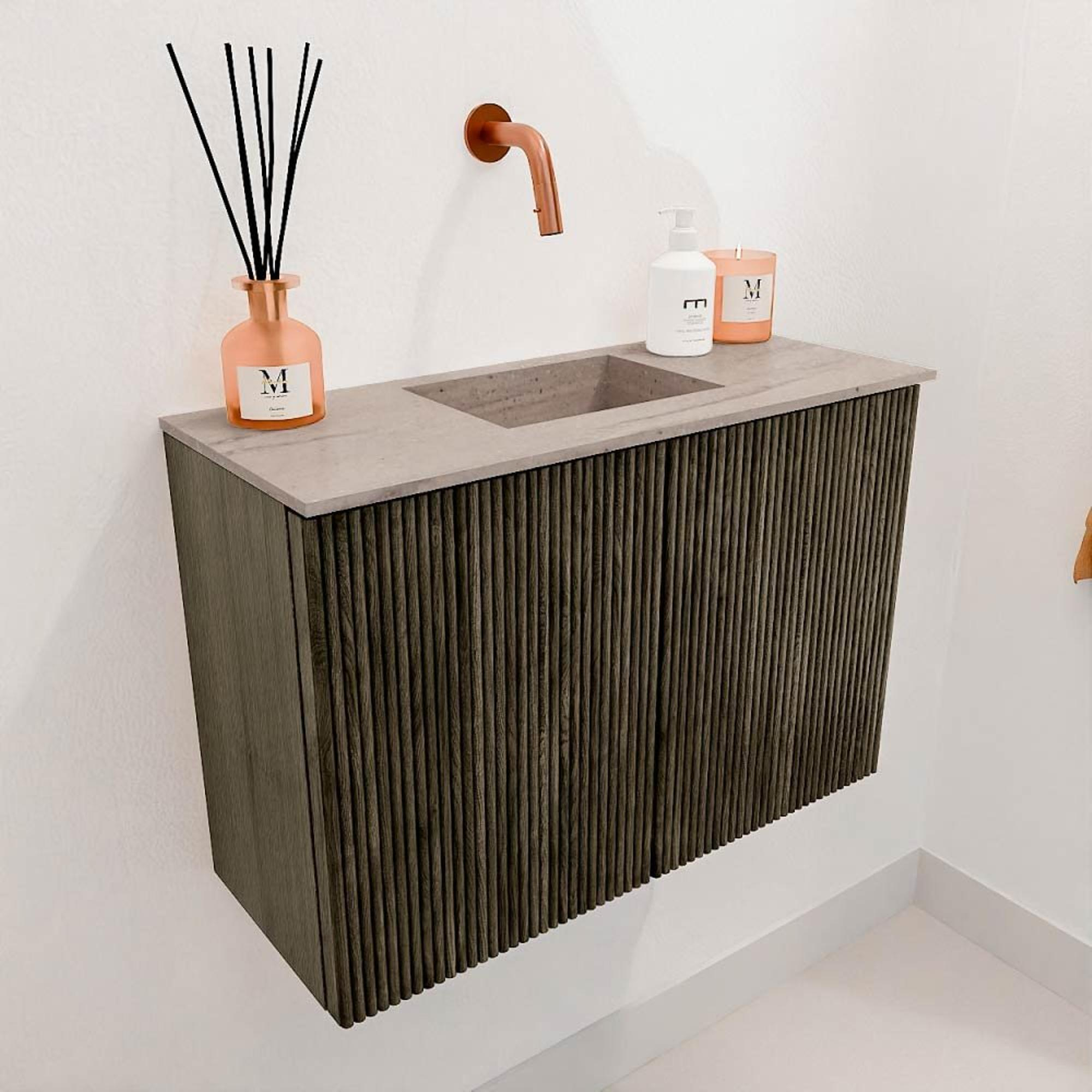 Het meubel valt direct op door zijn verfijnde uitstraling en de diepe, schaduwrijke kleur die een gevoel van luxe en warmte toevoegt aan elke ruimte. De verticale ribbelstructuur op het hout geeft het een unieke textuur die subtiel speelt met het licht, waardoor het meubel een levendige en uitnodigende uitstraling krijgt. Deze stijlvolle afwerking maakt het eenvoudig om het meubel te combineren met diverse badkamerstijlen, van modern tot klassiek. Zo creëer je moeiteloos een harmonieuze en verzorgde uitstraling in jouw badkamer.