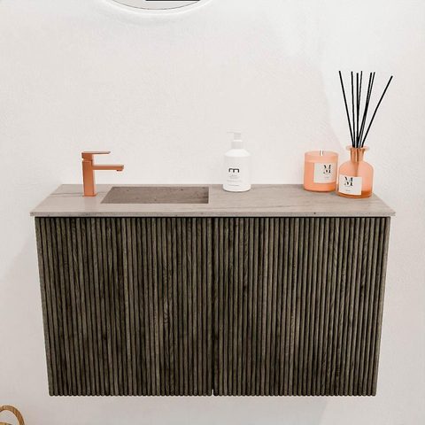 De elegante afwerking in de kleur Shadow geeft het meubel een moderne, maar toch warme uitstraling. Het massief eikenhout met verticale groeven voegt een subtiele textuur toe die direct opvalt. Hierdoor past het meubel moeiteloos in diverse interieurstijlen, van strak en minimalistisch tot natuurlijk en landelijk. Door de harmonieuze combinatie van grijs en beige creëer je een rustige en uitnodigende sfeer in jouw badkamer. Dit stijlvolle design zorgt ervoor dat je badkamer er altijd verzorgd en eigentijds uitziet.