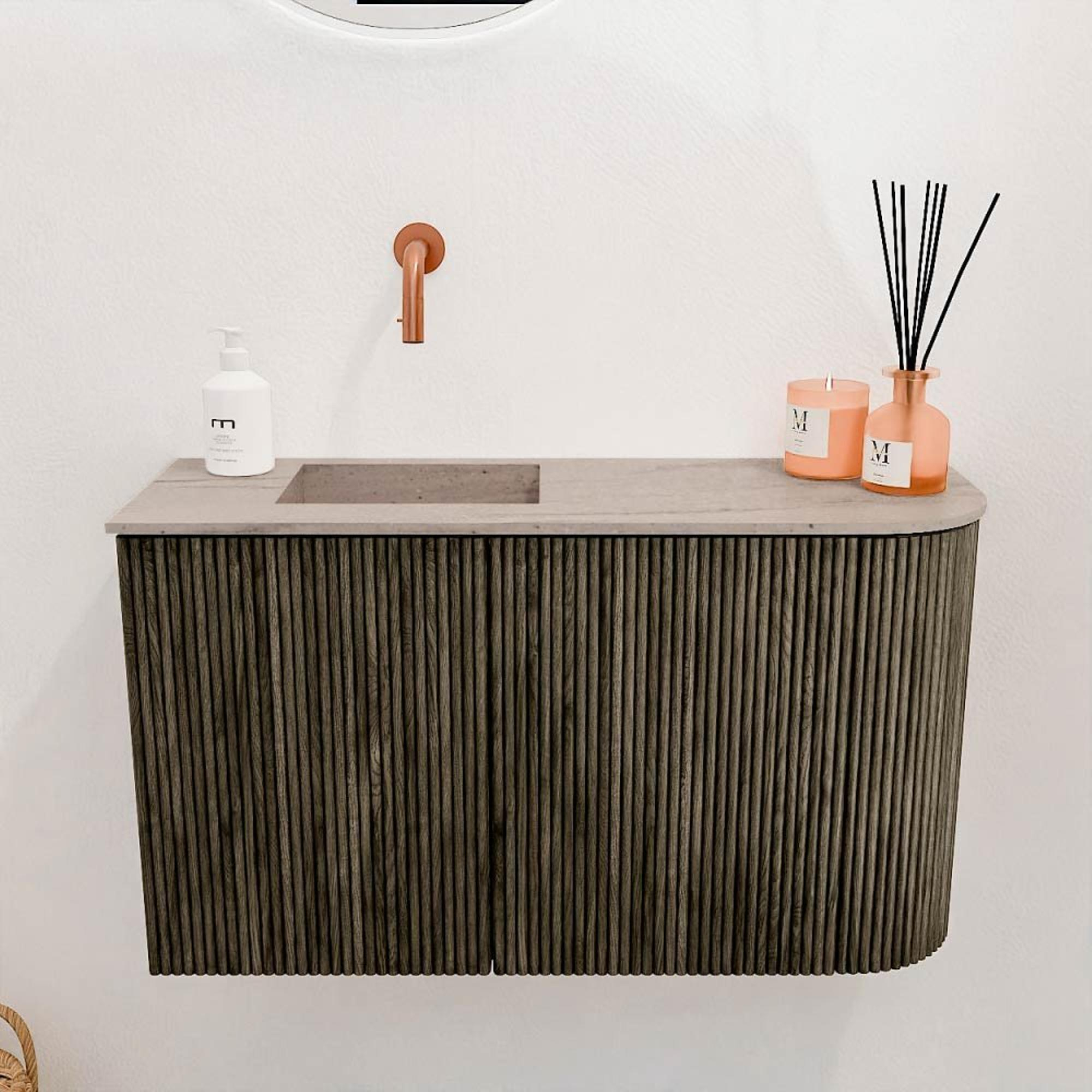 De combinatie van de diepe Shadow-kleur met de zachte ronding aan de rechterkant maakt dit meubel tot een echte blikvanger. Het design is modern en tijdloos, waardoor het moeiteloos past in uiteenlopende interieurstijlen. De wastafel in Saba-kleur voegt een subtiel contrast toe dat de aandacht trekt zonder te overheersen. Dit stijlvolle geheel zorgt ervoor dat jouw badkamer er verzorgd en uitnodigend uitziet, wat een positieve indruk maakt op iedereen die jouw gastenruimte betreedt.