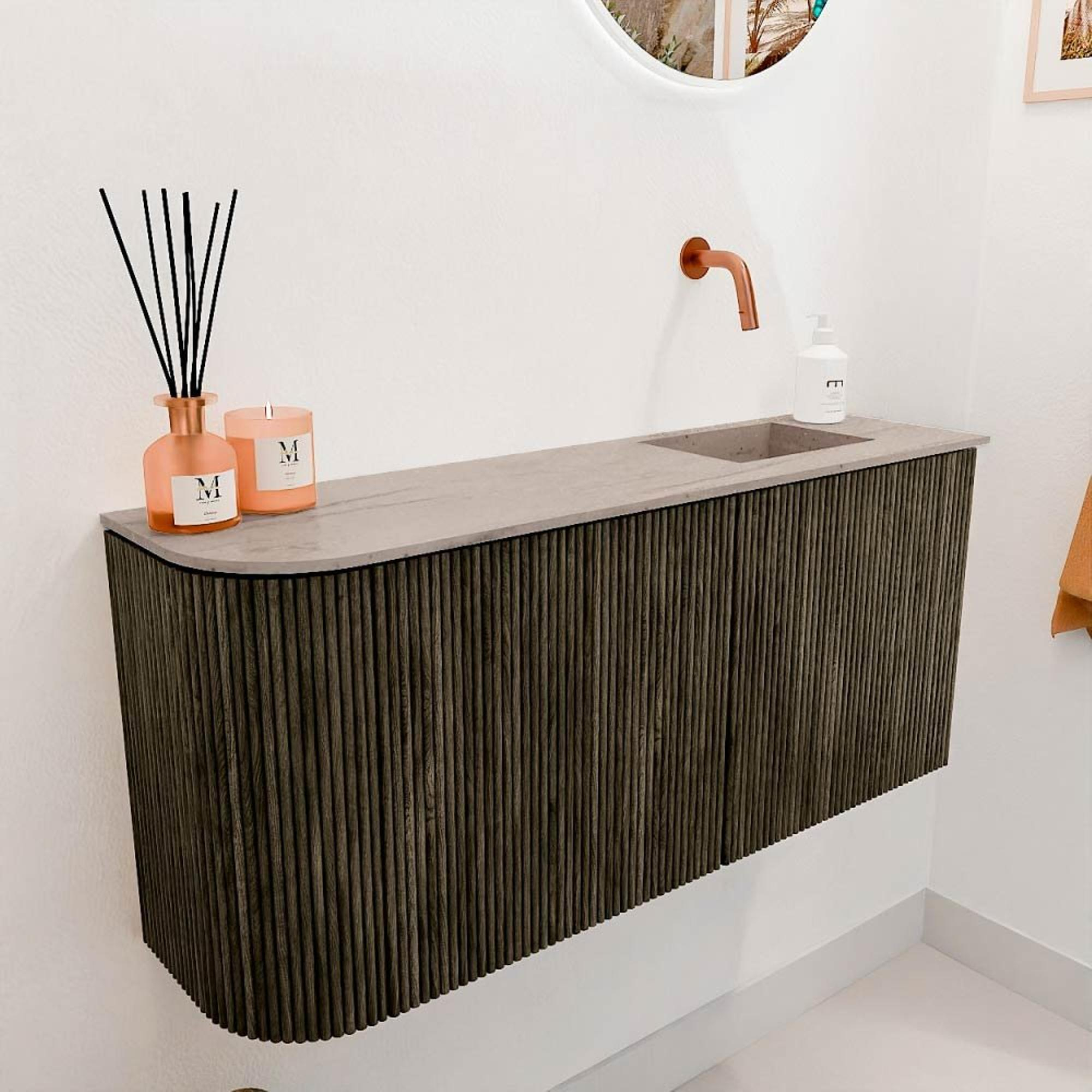 De unieke ronding aan de linkerkant geeft het meubel een onderscheidend karakter en zorgt voor een zachte, uitnodigende uitstraling. De kleur Shadow met een houtlook finish voegt warmte en diepte toe aan je ruimte, waardoor het meubel een natuurlijke en luxe sfeer creëert. Dankzij het doordachte ontwerp past het meubel naadloos in zowel moderne als klassieke badkamers. Zo geniet je van een tijdloos en stijlvol element dat je interieur verrijkt en je badkamer een persoonlijke touch geeft.
