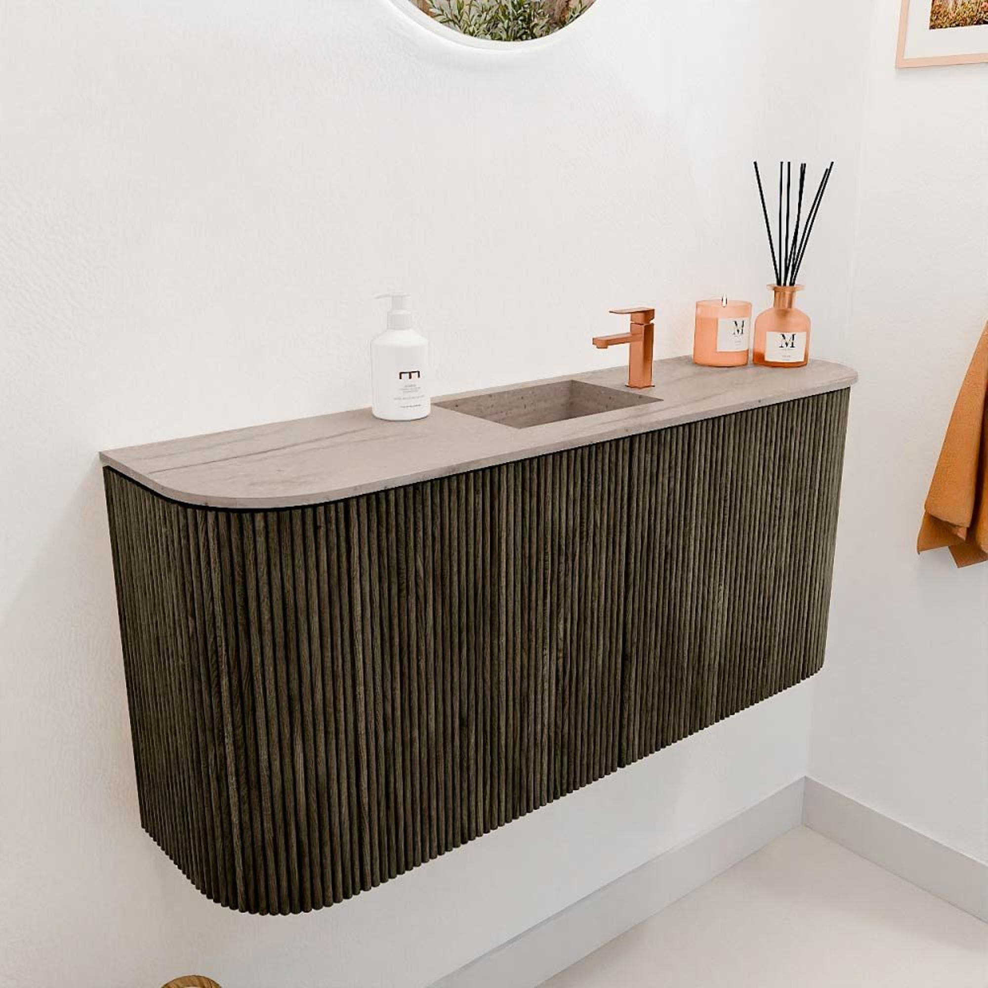 De combinatie van de warme Shadow-kleur met de natuurlijke uitstraling van massief eikenhout aan de fronten en eikenfineer aan de zijkanten geeft dit meubel een luxe en authentieke uitstraling. De afgeronde hoeken zorgen voor een zachte, uitnodigende vorm die het meubel een uniek karakter geeft. Dit maakt het niet alleen een functioneel element, maar ook een echte blikvanger in jouw badkamer. Door het tijdloze design past het meubel perfect bij zowel moderne als klassieke badkamers, waardoor je verzekerd bent van een duurzame investering in stijl.