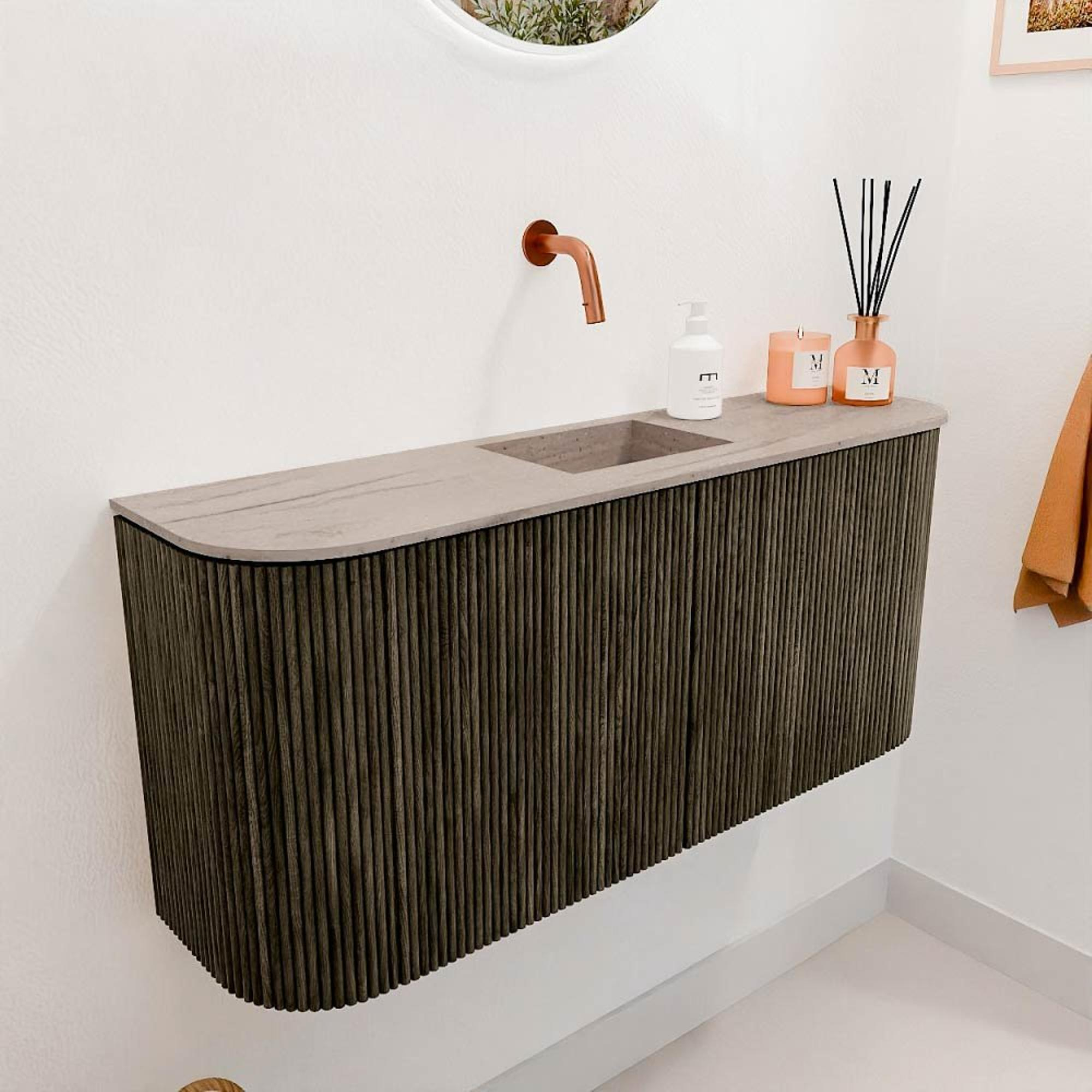 Het meubel valt direct op door zijn elegante ontwerp met subtiele rondingen aan beide zijden, wat een zachte en uitnodigende uitstraling geeft. De combinatie van de diepe Shadow kleur met de warme Saba wastafel zorgt voor een harmonieuze en natuurlijke look die moeiteloos in diverse badkamerstijlen past. De verticale ribbing in het hout voegt een verfijnde textuur toe, waardoor het meubel een luxe en tijdloze uitstraling krijgt. Hierdoor wordt jouw badkamer niet alleen functioneel, maar ook een plek waar je trots op bent.