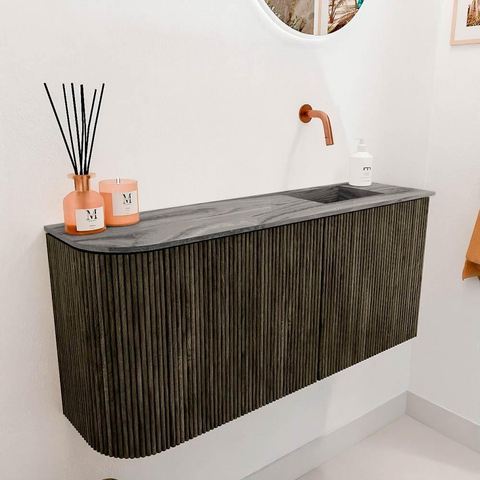Dit meubel valt direct op door zijn elegante uitstraling en doordachte design. De combinatie van massief eikenhout en eikenfineer geeft het een natuurlijke en warme uitstraling die je badkamer een luxe gevoel geeft. De donkere Shadow-kleur zorgt voor een moderne touch, die zowel strak als tijdloos is. Door de unieke ronding aan de linkerkant krijgt het meubel een speels accent, waardoor het niet alleen functioneel is, maar ook een echte eyecatcher in je badkamer. Met dit meubel voeg je moeiteloos stijl toe zonder in te leveren op comfort.
