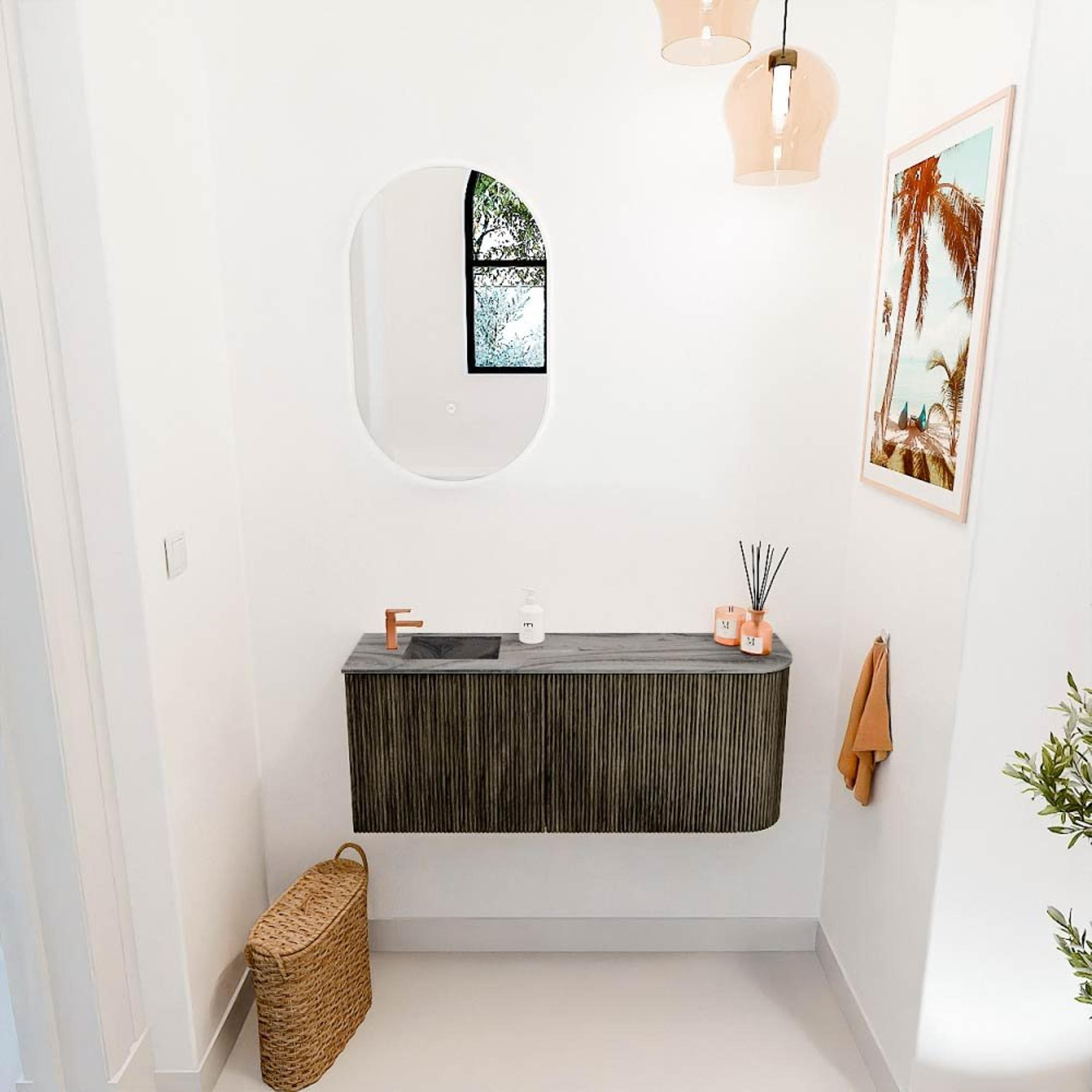 Met zijn diepe Shadow-kleur en de natuurlijke uitstraling van eikenhout straalt dit meubel pure elegantie uit. De afgeronde rechterzijde geeft het een unieke vorm die direct in het oog springt, zonder te overheersen. De wastafel in de kleur Sombra met een kraangat aan de linkerkant sluit naadloos aan bij het ontwerp en zorgt voor een moderne, strakke look. Dit meubel past perfect in zowel klassieke als eigentijdse badkamers en voegt een vleugje luxe toe zonder te overdrijven. Zo creëer je een badkamer die niet alleen mooi is, maar ook uitnodigt tot ontspanning.
