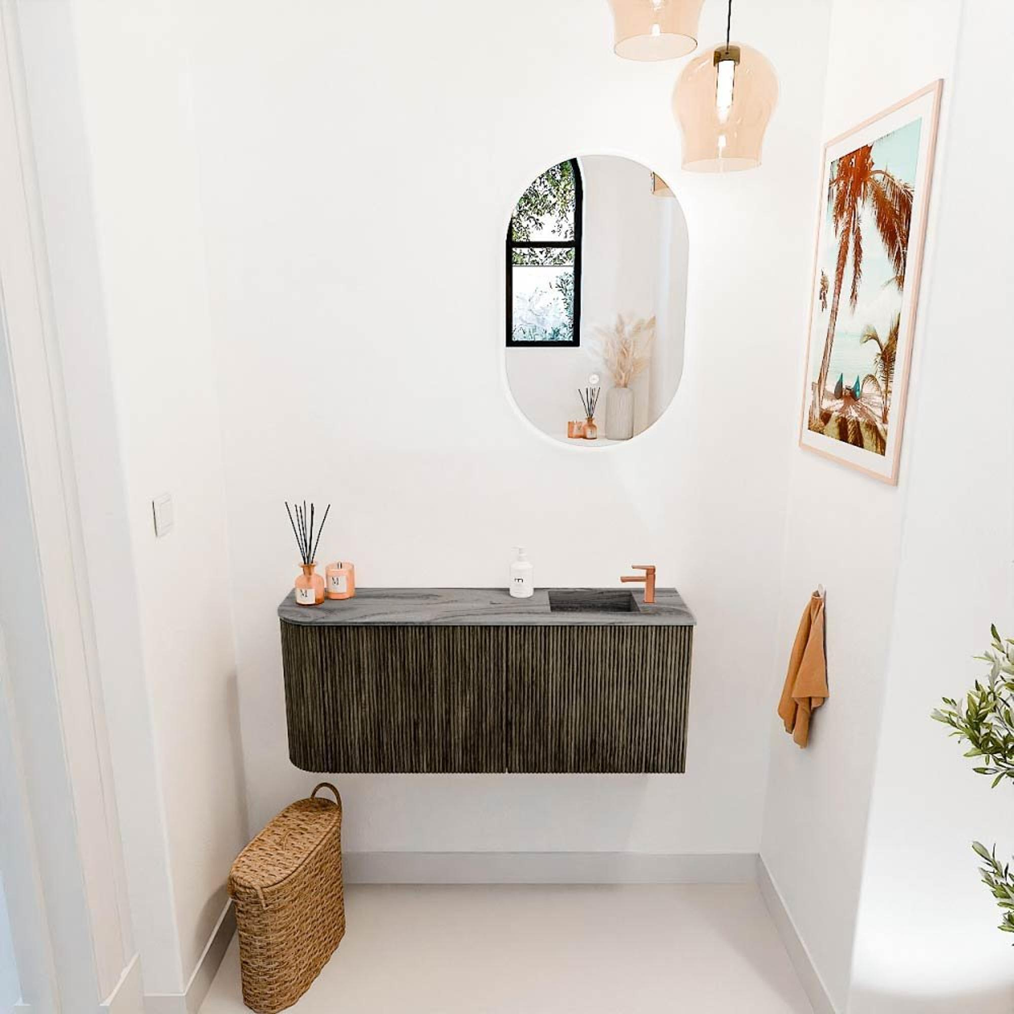 Het meubel valt meteen op door zijn verfijnde uitstraling en hoogwaardige afwerking. De combinatie van massief eiken fronten met eiken fineer aan de zijkanten in de warme Shadow-kleur zorgt voor een natuurlijke en luxe look. De subtiele ronding aan de linkerkant geeft het meubel een uniek karakter dat je nergens anders vindt. Zo voeg je een stijlvol element toe aan je badkamer dat moeiteloos aansluit bij verschillende interieurstijlen, van modern tot klassiek. Dankzij het doordachte ontwerp straalt je badkamer rust en elegantie uit.