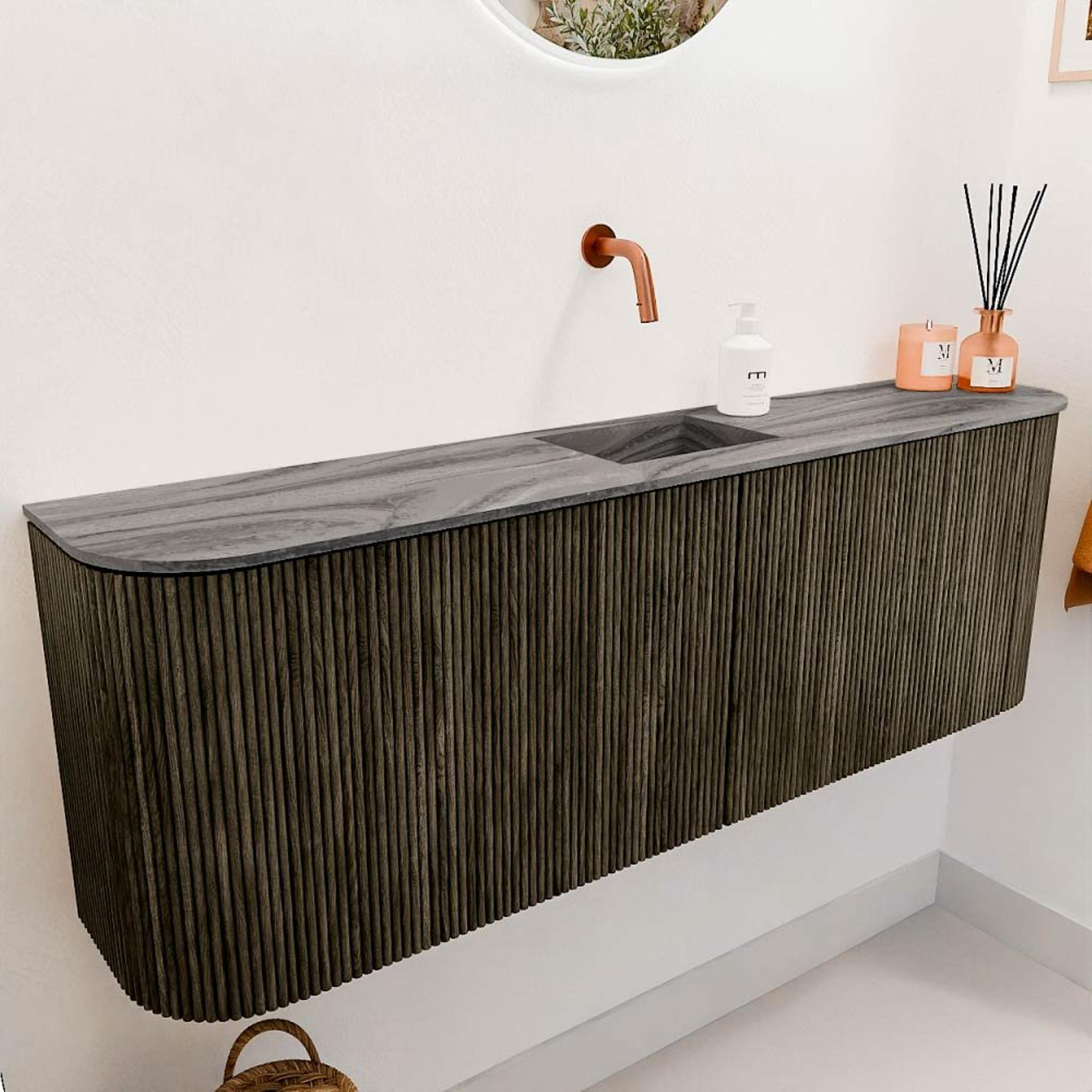 Het meubel valt direct op door het elegante design met verticale ribbels die een subtiele textuur toevoegen zonder te overheersen. De combinatie van de kleuren Shadow en Sombra zorgt voor een rustige, maar toch karaktervolle uitstraling. Door de afgeronde hoeken aan beide zijden oogt het geheel zachter en vriendelijker, wat bijdraagt aan een warme sfeer in je badkamer. Dit stijlvolle meubel past moeiteloos in diverse interieurstijlen, van modern minimalistisch tot tijdloos klassiek, en tilt jouw badkamer naar een hoger niveau.