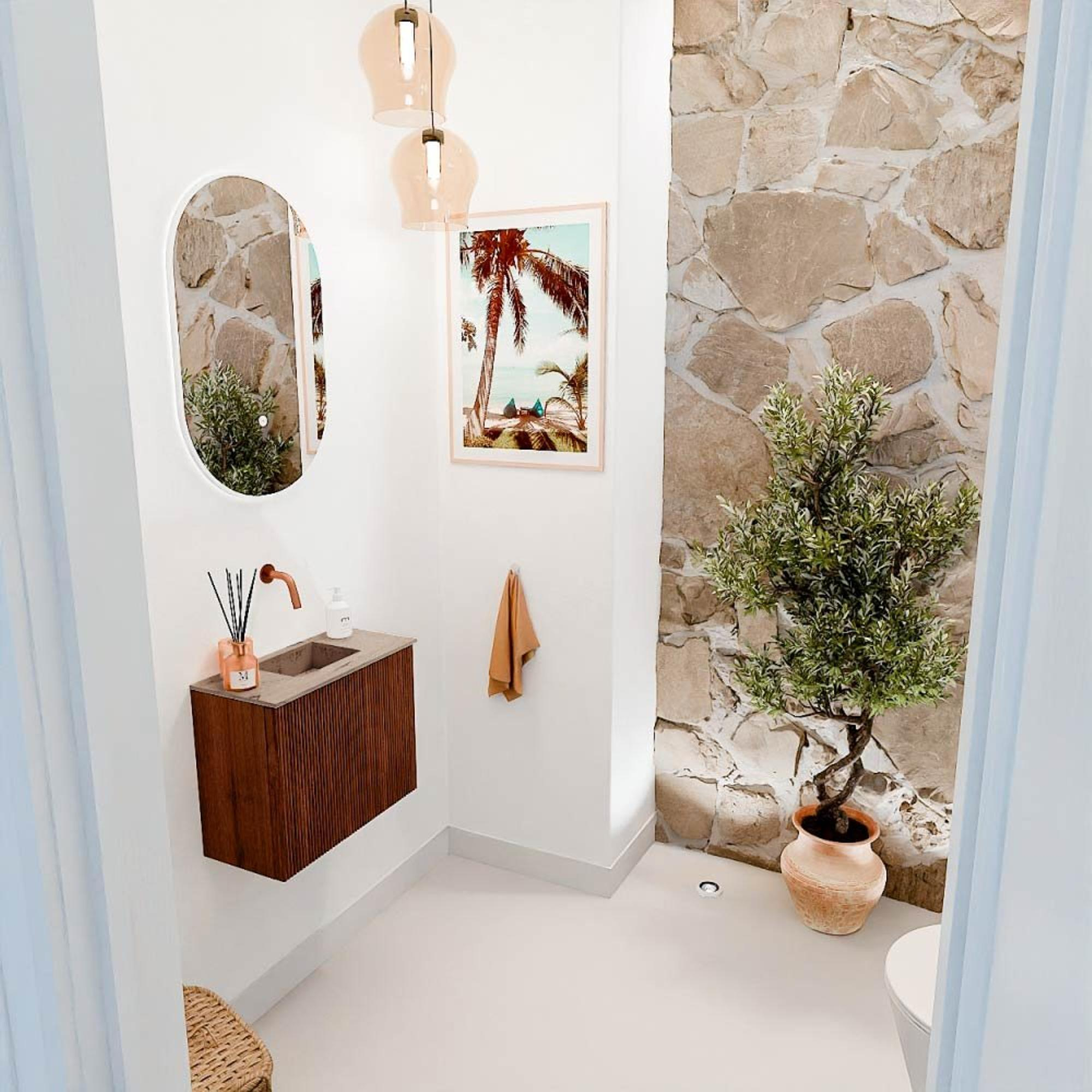 Met dit compacte meubel geef je jouw toiletruimte een stijlvolle en warme uitstraling die direct opvalt. De combinatie van een prachtige, robuuste houten kast met een strak vormgegeven wastafel zorgt voor een perfecte balans tussen natuurlijk comfort en modern design. Dankzij de royale opbergruimte achter de deur houd je alles netjes uit het zicht, terwijl de hoogwaardige afwerking in de kleur Ruby een luxe sfeer toevoegt. Dit meubel is ideaal voor kleinere ruimtes waar je toch niet wilt inleveren op kwaliteit en uitstraling. Door de wandmontage oogt het geheel bovendien ruimtelijk en gemakkelijk schoon te houden. Zo transformeer je jouw badkamer of toilet in een plek waar je elke dag met plezier begint en eindigt.