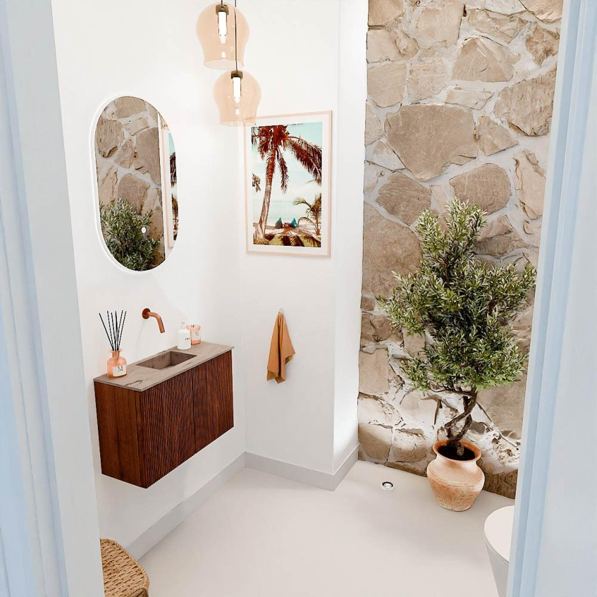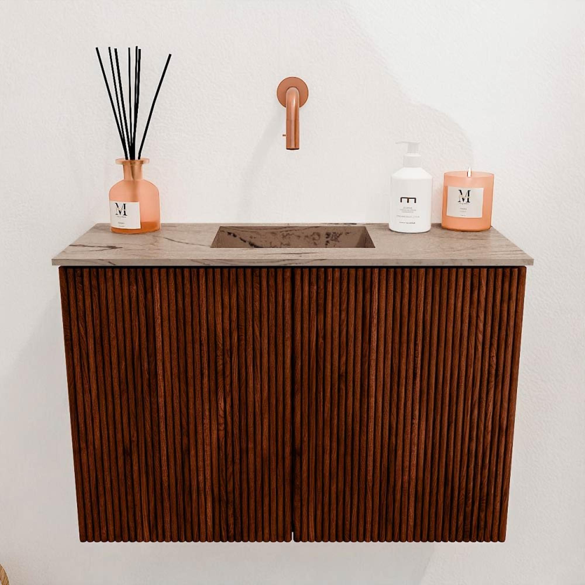 Met dit prachtige meubel geef je jouw badkamer of gastentoilet direct een warme en stijlvolle uitstraling. Het compacte formaat maakt het ideaal voor kleinere ruimtes, zonder in te leveren op functionaliteit. De combinatie van het kastje in een diepe Ruby kleur met de subtiele, beige wastafel in Arena zorgt voor een verrassend elegant contrast. Dankzij het natuurlijke houtfineer met verticale groeven krijgt het meubel een tijdloos karakter dat moeiteloos aansluit bij diverse interieurstijlen. Dit meubel is niet alleen een lust voor het oog, maar ook bijzonder praktisch: het biedt voldoende opbergruimte om jouw badkamer netjes en overzichtelijk te houden. Zo geniet je elke dag van een opgeruimde en sfeervolle ruimte waar je je helemaal thuis voelt.