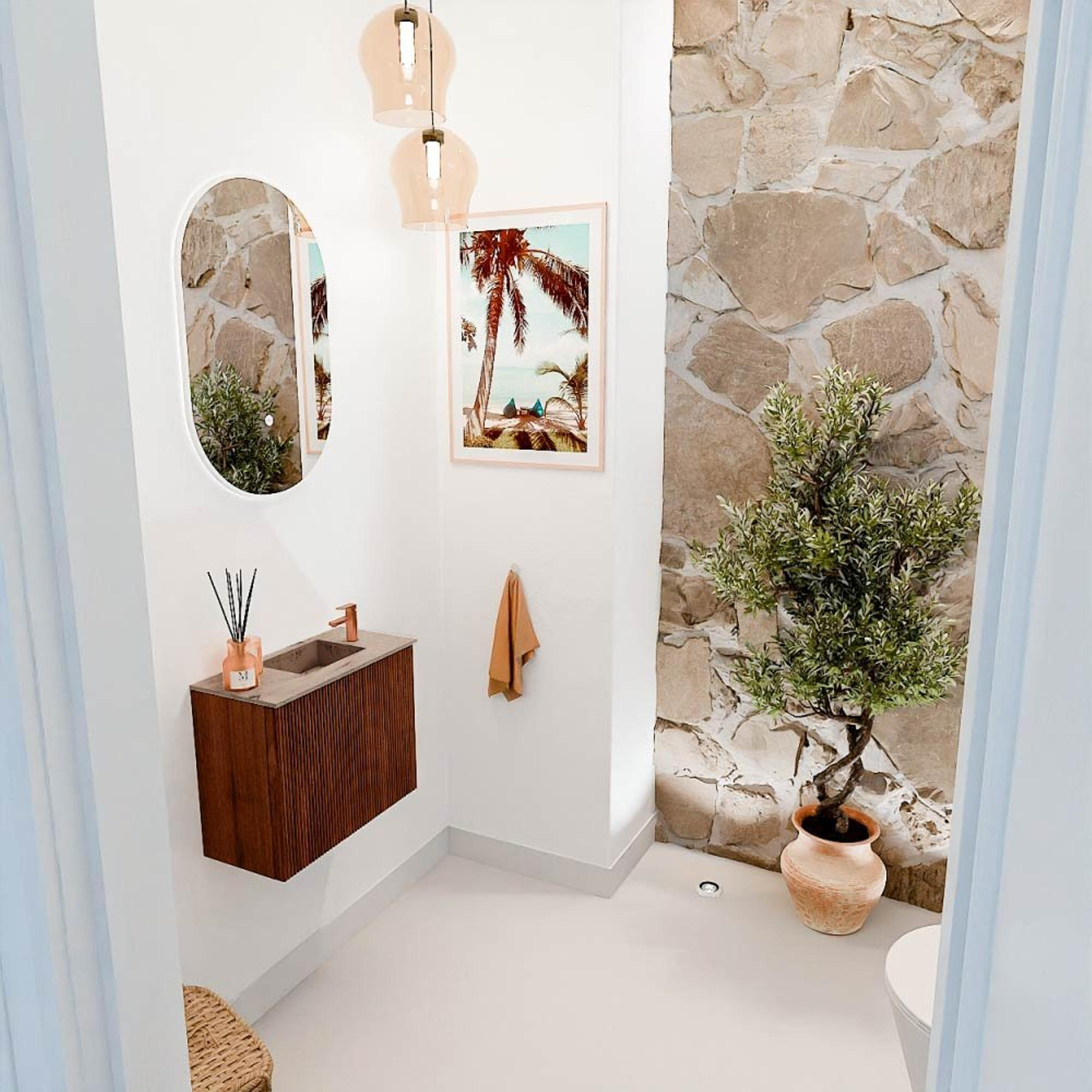 Met dit compacte meubel geef je jouw badkamer of gastentoilet direct een stijlvolle en praktische upgrade. Het meubel combineert een warme, robuuste uitstraling met een slimme indeling die perfect past in kleinere ruimtes. Dankzij de subtiele diepte van 24,5 cm neemt het nauwelijks ruimte in beslag, terwijl je toch voldoende opbergruimte hebt achter de strakke deur. De combinatie van het dieprode Ruby-kleurige kastje met de zachte, beige wastafel in Arena zorgt voor een verrassend elegant contrast dat je badkamer een unieke sfeer geeft. De wastafel is rechts gepositioneerd en voorzien van één kraangat, wat zorgt voor een overzichtelijke en functionele indeling. Dit meubel maakt het mogelijk om je badkamer praktisch in te richten zonder in te leveren op stijl of kwaliteit.