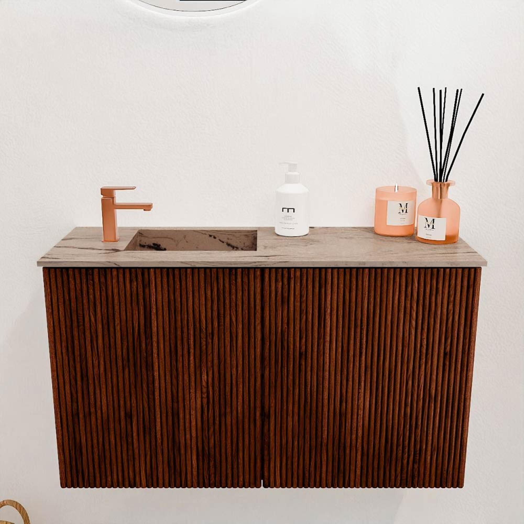 Met twee ruime deuren biedt het meubel voldoende opbergruimte om al je badkamerbenodigdheden netjes en uit het zicht te houden. De wastafel met een kraangat aan de linkerkant is ideaal voor een kraaninstallatie die precies aansluit bij jouw wensen. Dankzij de wandmontage blijft de vloer vrij, wat zorgt voor een ruimtelijk gevoel en het schoonmaken vergemakkelijkt. Dit meubel is ontworpen met oog voor praktische details, zodat je badkamer niet alleen mooi, maar ook efficiënt en overzichtelijk blijft.
