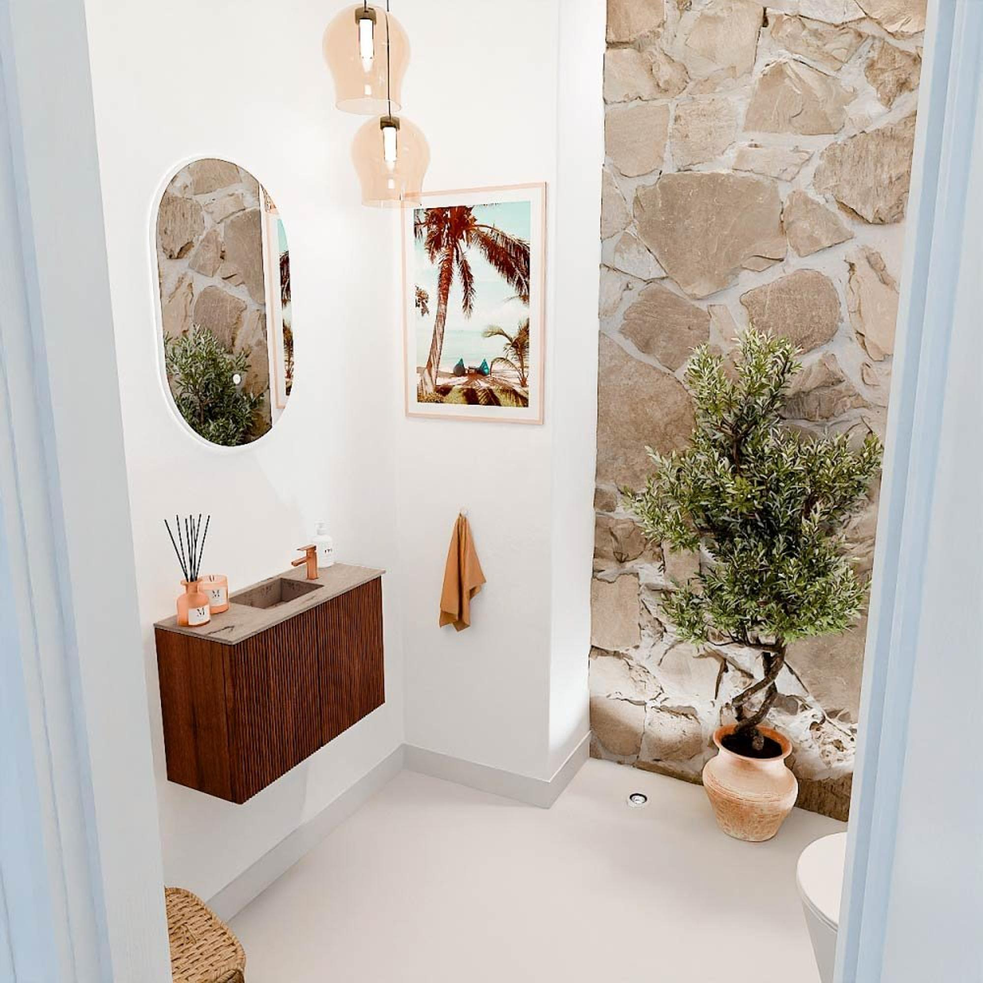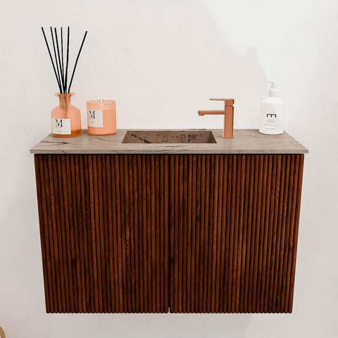 Het meubel valt direct op door zijn elegante Ruby-kleur en de natuurlijke uitstraling van de melamine fronten. De combinatie van warme tinten en een strak design zorgt voor een tijdloze look die moeiteloos past in diverse badkamerstijlen. Of je nu houdt van modern, klassiek of een mix van beide, dit meubel voegt altijd een vleugje verfijning toe. De wastafel in de kleur Arena sluit naadloos aan bij het meubel en versterkt het geheel met een subtiele, lichte toets. Zo creëer je een harmonieus en uitnodigend geheel waar je trots op kunt zijn.