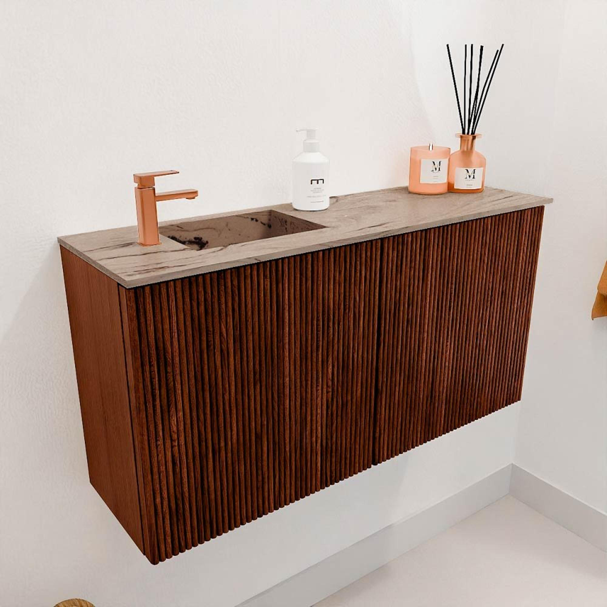 Met dit prachtige meubel geef je jouw badkamer direct een warme en luxueuze uitstraling. Het combineert de natuurlijke charme van massief eikenhout met een moderne, verfijnde vormgeving die elke ruimte verrijkt. Dankzij de subtiele verticale groeven en de diepe Ruby-kleur voelt het meubel niet alleen stijlvol aan, maar ook uitnodigend en persoonlijk. De links geplaatste wastafel in een zachte Arena-tint voegt een rustgevende, natuurlijke touch toe, waardoor je badkamer een oase van rust wordt. Dit meubel is niet zomaar een functioneel element, maar een echte eyecatcher die jouw dagelijkse routine aangenamer maakt. Door de slimme indeling met twee deuren heb je voldoende opbergruimte om alles netjes uit het zicht te houden. Zo geniet je van een opgeruimde, serene badkamer waar je elke dag met plezier begint en eindigt.