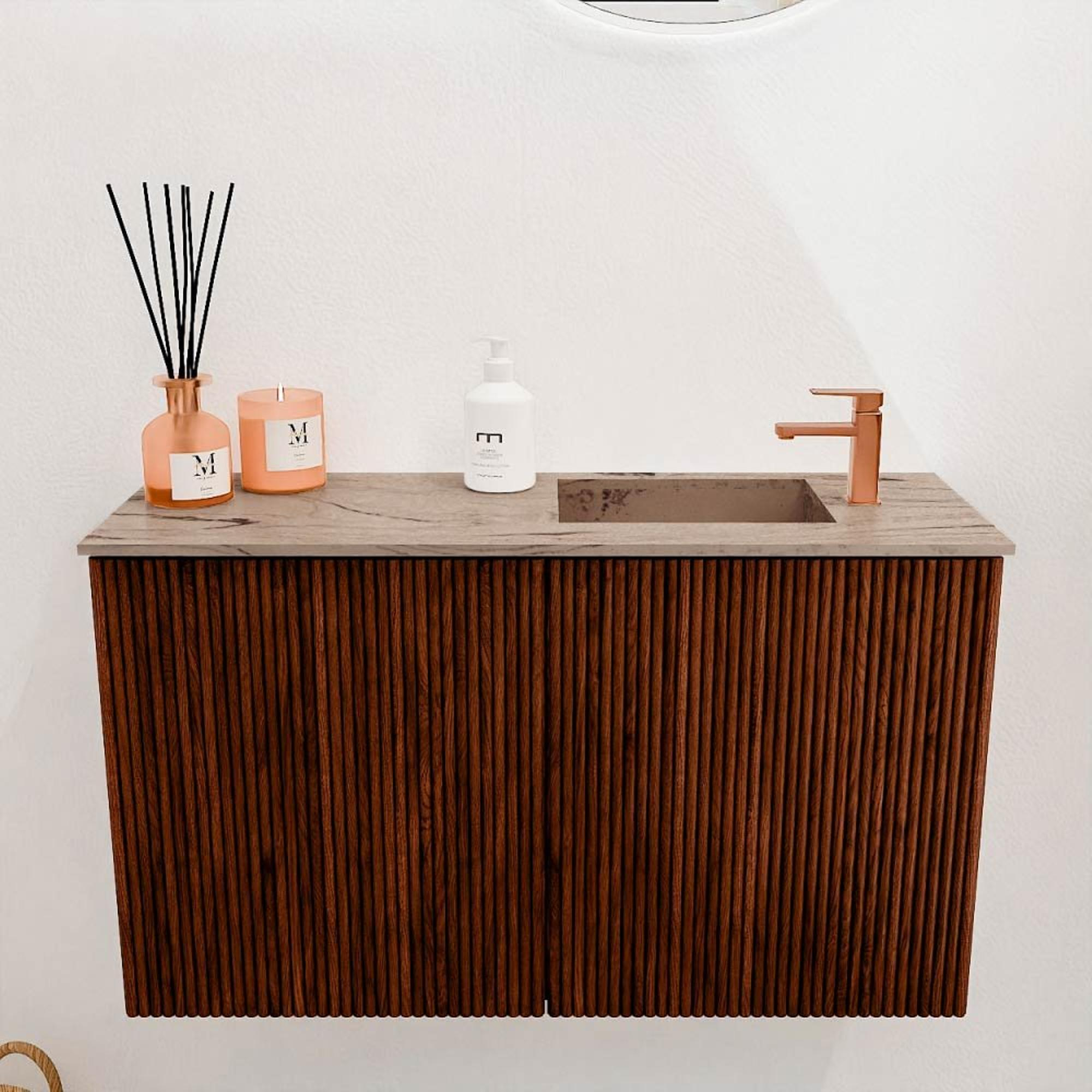 De warme Ruby-kleur in combinatie met de verticale groeven en het massief eikenhout geeft dit meubel een tijdloze en stijlvolle uitstraling. Het is een echte eyecatcher die jouw badkamer een natuurlijke en luxe sfeer geeft. Door het gebruik van hoogwaardige materialen straalt het meubel kwaliteit en vakmanschap uit. Dit zorgt ervoor dat je badkamer er niet alleen mooi uitziet, maar ook een plek wordt waar je je echt thuis voelt. Bovendien past het design moeiteloos bij verschillende interieurstijlen, van modern tot klassiek, waardoor het een veelzijdige keuze is.