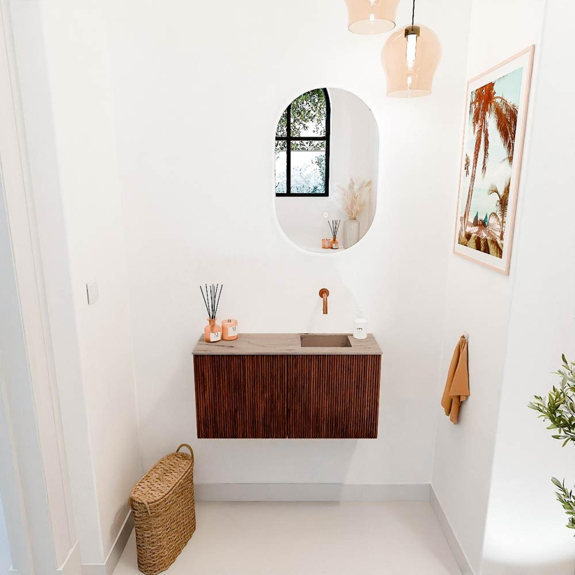 Met dit prachtige meubel geef je jouw badkamer of gastentoilet direct een stijlvolle en praktische upgrade. De combinatie van warme Ruby-kleur en het elegante ontwerp zorgt voor een sfeervolle uitstraling die je elke dag weer blij maakt. Dankzij het slimme formaat van 80 cm breed past het meubel perfect in kleinere ruimtes, zonder dat je inlevert op opbergruimte. De wastafel, met een subtiele Arena-kleur en rechts gepositioneerd, sluit naadloos aan op het meubel en biedt een frisse, moderne touch. Dit meubel maakt het eenvoudig om je badkamer netjes en georganiseerd te houden, terwijl het tegelijkertijd een echte blikvanger is. Door het ontbreken van een kraangat kun je zelf kiezen welke kraan het beste bij jouw stijl en wensen past. Zo creëer je een persoonlijke en functionele ruimte waar je elke dag met plezier begint.