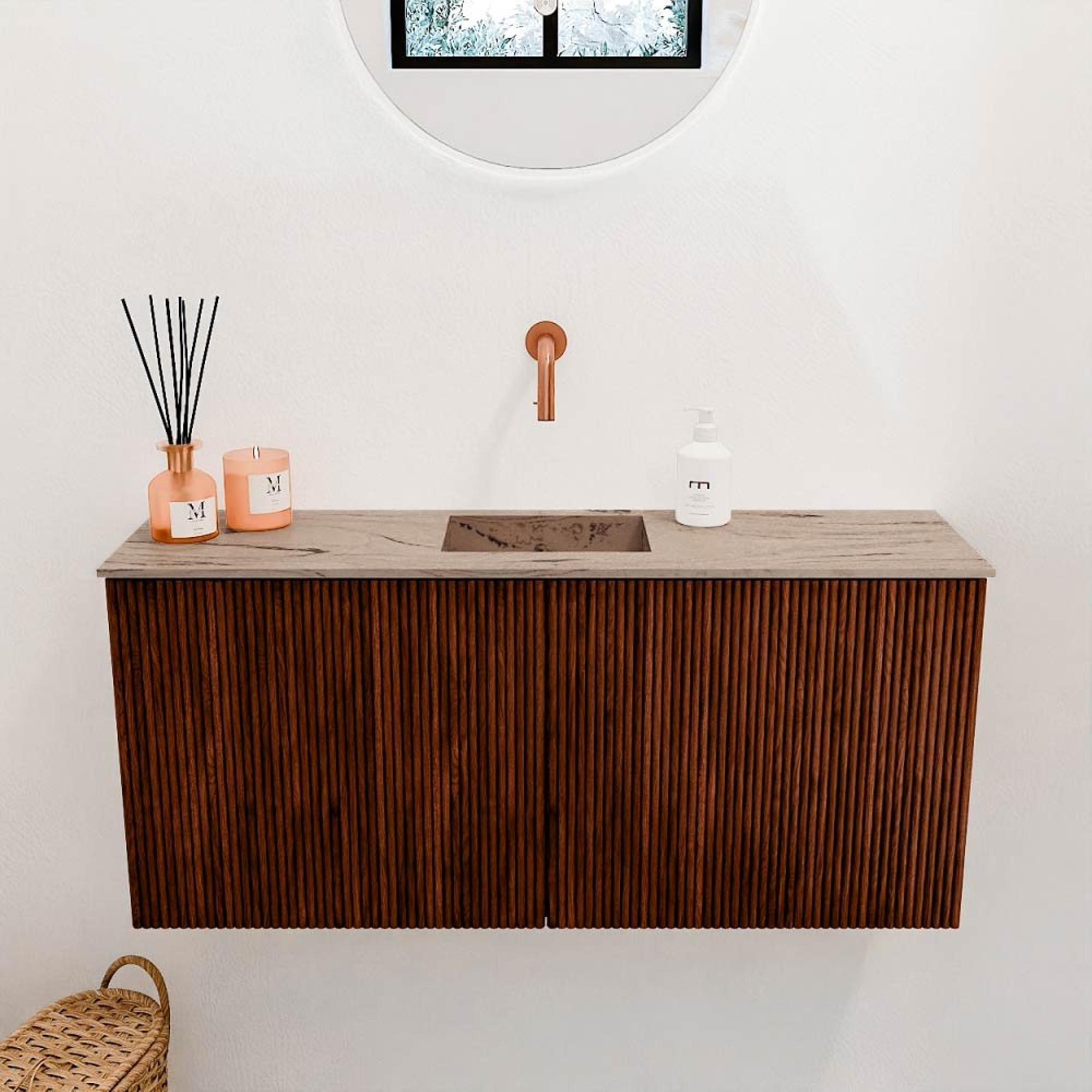 Het meubel straalt pure elegantie uit dankzij de combinatie van massief eikenhout en eikenfineer, afgewerkt in een warme Ruby-kleur. De verticale groeven in het front zorgen voor een subtiele textuur en een moderne uitstraling die jouw badkamer direct een upgrade geeft. Door het tijdloze design past dit meubel moeiteloos in zowel klassieke als moderne badkamers. De wastafel in de zachte Arena-kleur vormt een prachtig contrast en benadrukt de hoogwaardige afwerking. Zo geniet je niet alleen van functionaliteit, maar ook van een stijlvol element dat jouw persoonlijke smaak weerspiegelt.