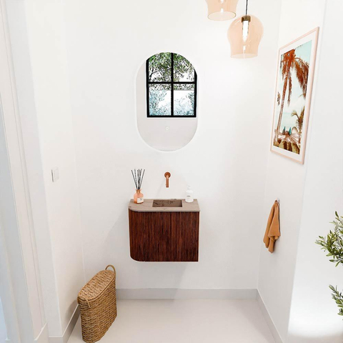 Dit meubel valt direct op door zijn unieke kleur Ruby, die warmte en karakter toevoegt aan je badkamer. De zachte ronding aan de linkerkant geeft het geheel een speelse en moderne uitstraling, waardoor het zich onderscheidt van standaard meubelen. De Arena-kleurige wastafel vormt een prachtig contrast en zorgt voor een frisse, lichte touch. Door deze combinatie van kleuren en vormen krijgt jouw badkamer een persoonlijke en eigentijdse sfeer die uitnodigt tot ontspanning. Bovendien zorgt het strakke ontwerp ervoor dat het meubel naadloos aansluit bij verschillende interieurstijlen, van modern tot klassiek. Zo geniet je niet alleen van een functioneel meubel, maar ook van een echte blikvanger die jouw badkamer compleet maakt.