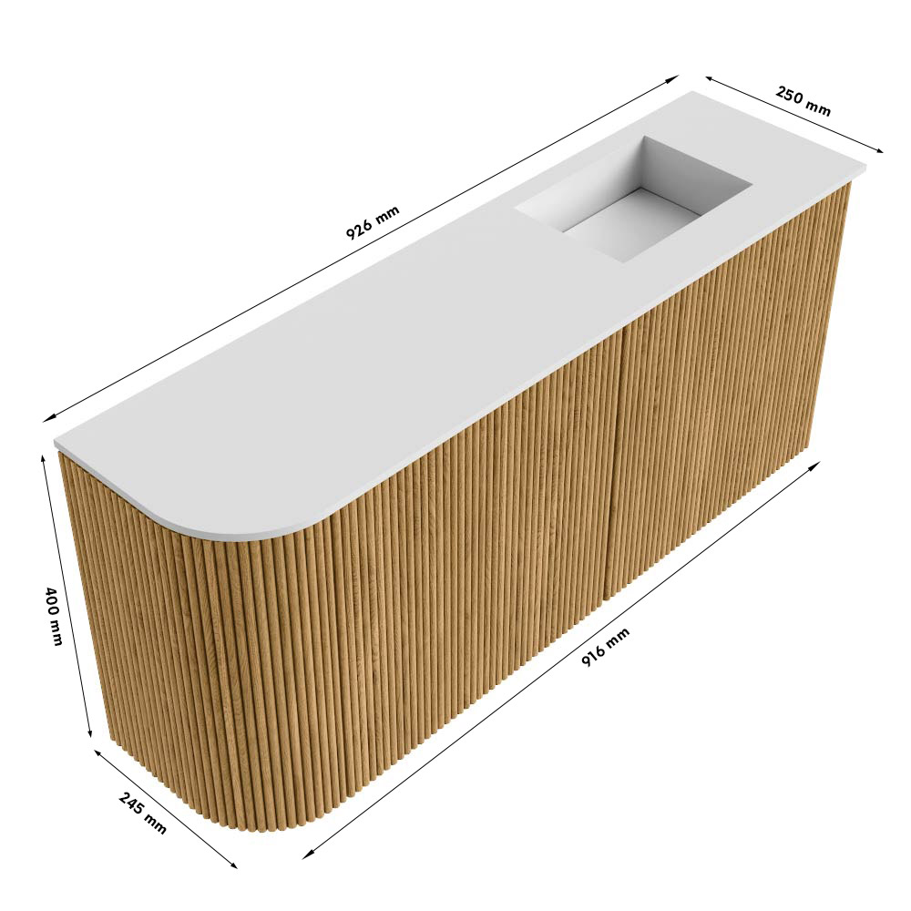 Met een breedte van 91,6 cm en een diepte van slechts 24,5 cm is dit meubel ideaal voor kleinere badkamers of toiletten waar ruimte schaars is. De wastafel is rechts gepositioneerd zonder kraangat, waardoor je zelf de vrijheid hebt om een kraan naar keuze te plaatsen die perfect bij jouw stijl past. Het meubel biedt voldoende opbergruimte achter de deuren, zodat je al je badkamerbenodigdheden netjes kunt opbergen en je werkblad vrij blijft. De wandmontage zorgt voor een zwevend effect, wat de ruimte optisch vergroot en het schoonmaken vergemakkelijkt.