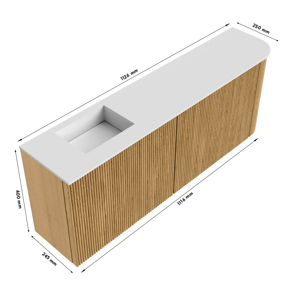 Met een breedte van 111,6 cm en een diepte van 24,5 cm biedt dit meubel voldoende opbergruimte zonder dat het te veel ruimte inneemt. De wastafel met één kraangat is ideaal voor een strak en overzichtelijk design, terwijl de positie aan de linkerkant zorgt voor een prettige werkruimte. Het meubel is ontworpen voor wandmontage, waardoor je de vloer vrij houdt en de badkamer optisch ruimer oogt. Zo combineer je functionaliteit met een fraai design, wat jouw dagelijkse routine een stuk aangenamer maakt.