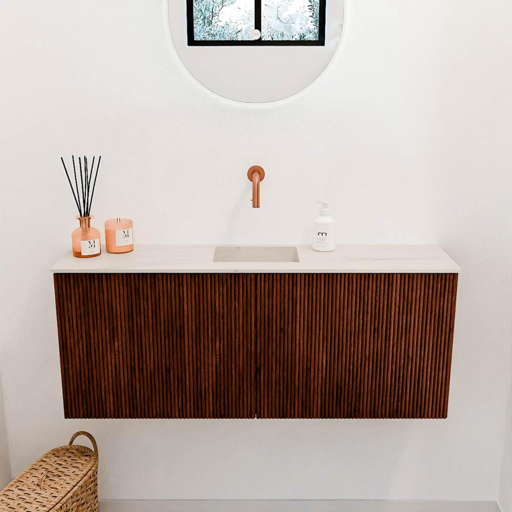 Met dit prachtige meubel geef je jouw badkamer of gastentoilet direct een stijlvolle en warme uitstraling. Het combineert de natuurlijke charme van massief eikenhout met een moderne, strakke vormgeving die moeiteloos in diverse interieurstijlen past. Dankzij de royale breedte van 100 cm biedt het meubel voldoende opbergruimte om je badkamer netjes en overzichtelijk te houden. De subtiele verticale groeven in het front zorgen voor een verfijnde uitstraling, terwijl de warme Ruby-kleur het geheel een luxe en uitnodigende sfeer geeft. De bijpassende wastafel in de kleur Meli, met een centrale positie en zonder kraangat, maakt het plaatje compleet en geeft je de vrijheid om zelf een kraan naar keuze te plaatsen. Dit meubel is niet alleen een lust voor het oog, maar ook een praktische toevoeging die jouw dagelijkse routine aangenamer maakt.