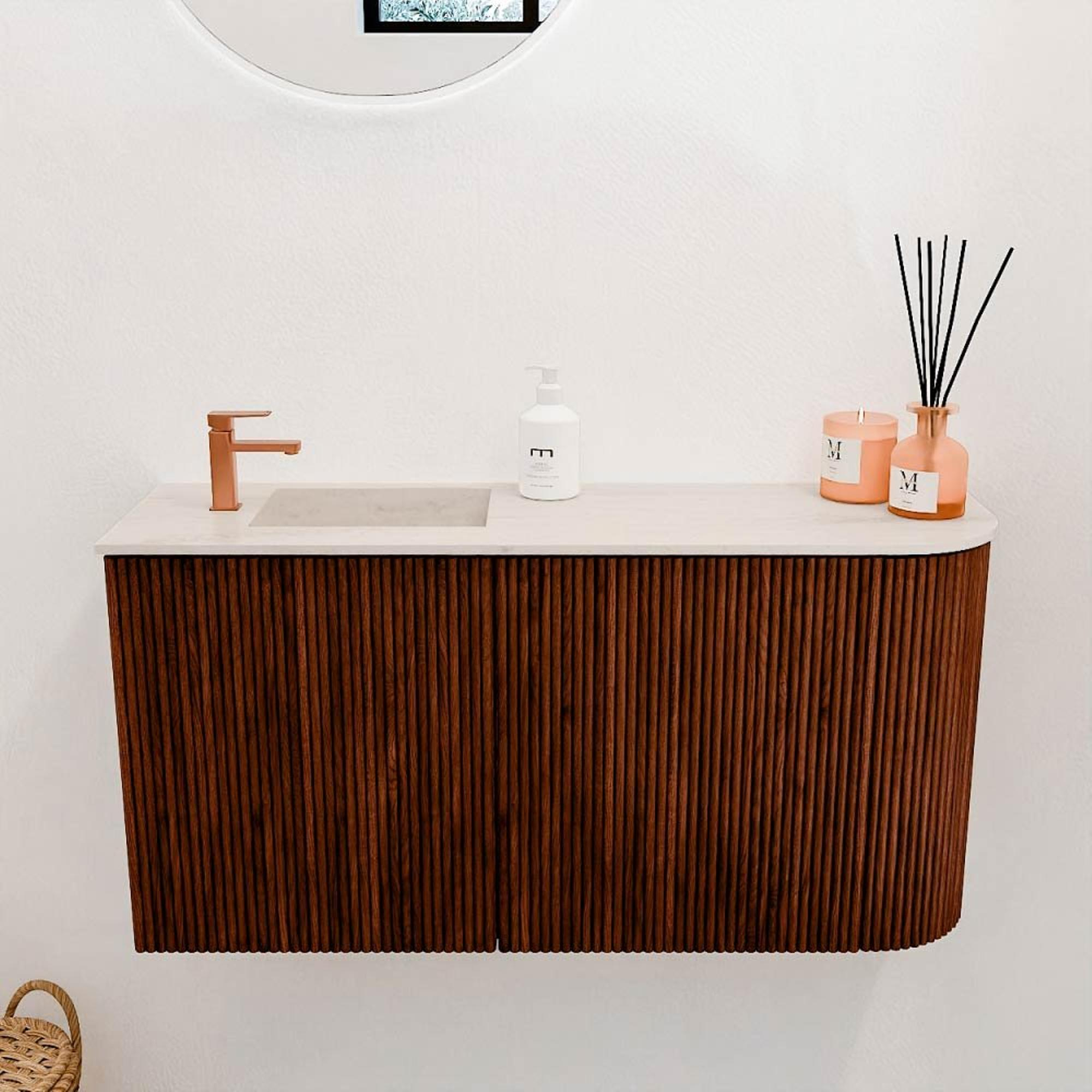 - Wastafel Faye in Meli-kleur met links geplaatste kraangat voor optimaal gebruiksgemak