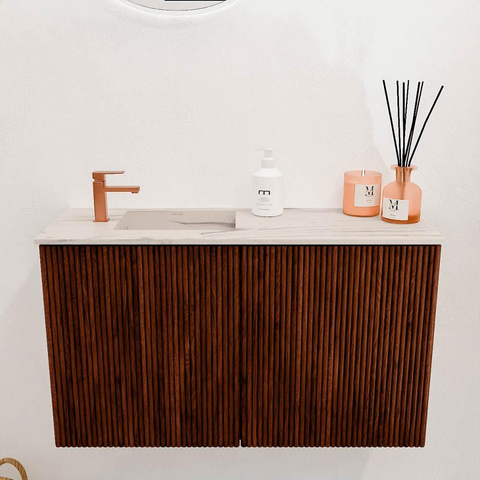 Met twee ruime deuren biedt het meubel voldoende opbergruimte voor al je badkamerbenodigdheden. De links geplaatste kraangat op de wastafel maakt het gebruik extra praktisch, vooral in kleinere badkamers waar elke centimeter telt. Het meubel is ontworpen voor wandmontage, waardoor de vloer vrij blijft en je badkamer direct ruimer oogt. Zo combineer je moeiteloos stijl met slimme oplossingen die jouw dagelijkse routine vereenvoudigen.