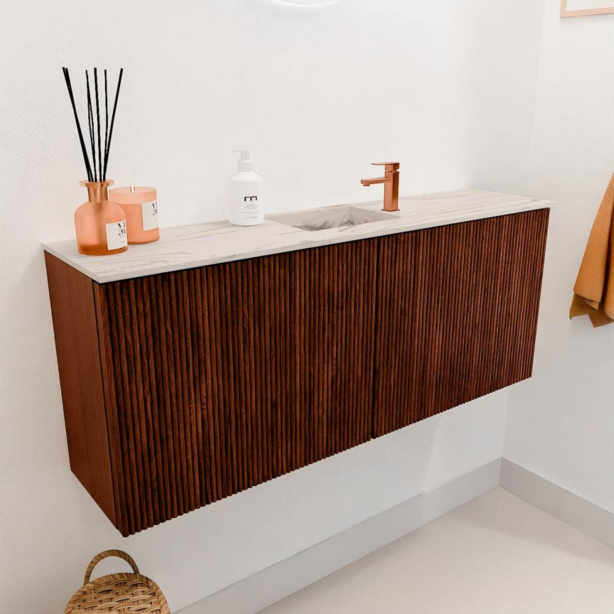Transformeer jouw badkamer met dit prachtige meubel dat niet alleen praktisch is, maar ook een echte eyecatcher vormt. De warme, robuuste uitstraling van het hout in combinatie met de diepe Ruby-kleur geeft je ruimte direct een luxe en sfeervolle ambiance. Dankzij het slimme ontwerp met een wastafel die centraal gepositioneerd is, geniet je van optimale functionaliteit zonder in te leveren op stijl. Dit meubel brengt rust en overzicht in je badkamer, terwijl het voldoende opbergruimte biedt om alles netjes en binnen handbereik te houden. Het is een perfecte balans tussen design en gebruiksgemak, waardoor jouw dagelijkse routine een stuk aangenamer wordt.