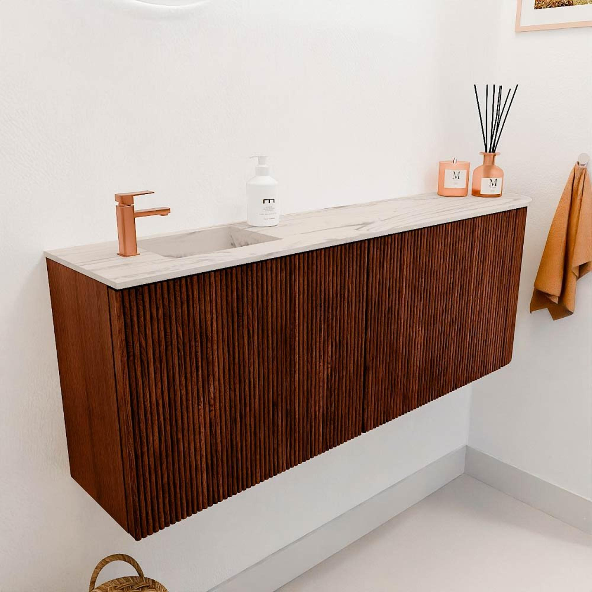 Met een breedte van 111,6 cm biedt dit meubel voldoende opbergruimte om jouw badkamer netjes en georganiseerd te houden. De wastafel met één kraangat is ideaal voor een kraan naar keuze en de linkerpositie zorgt voor een praktische indeling. De wandmontage maakt het schoonmaken van de vloer eenvoudig en geeft een ruimtelijk effect. Hierdoor geniet je van een badkamer die niet alleen mooi is, maar ook perfect aansluit bij jouw dagelijkse behoeften.