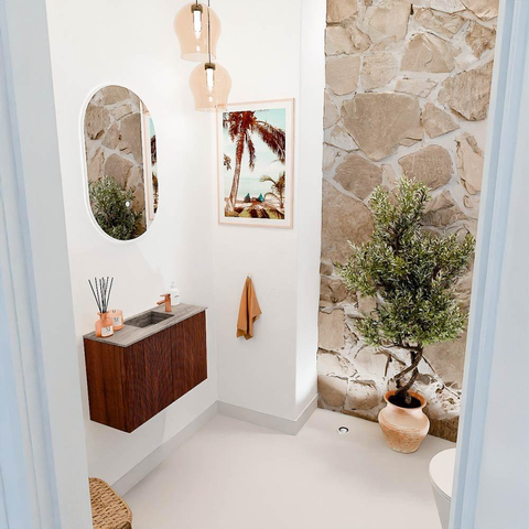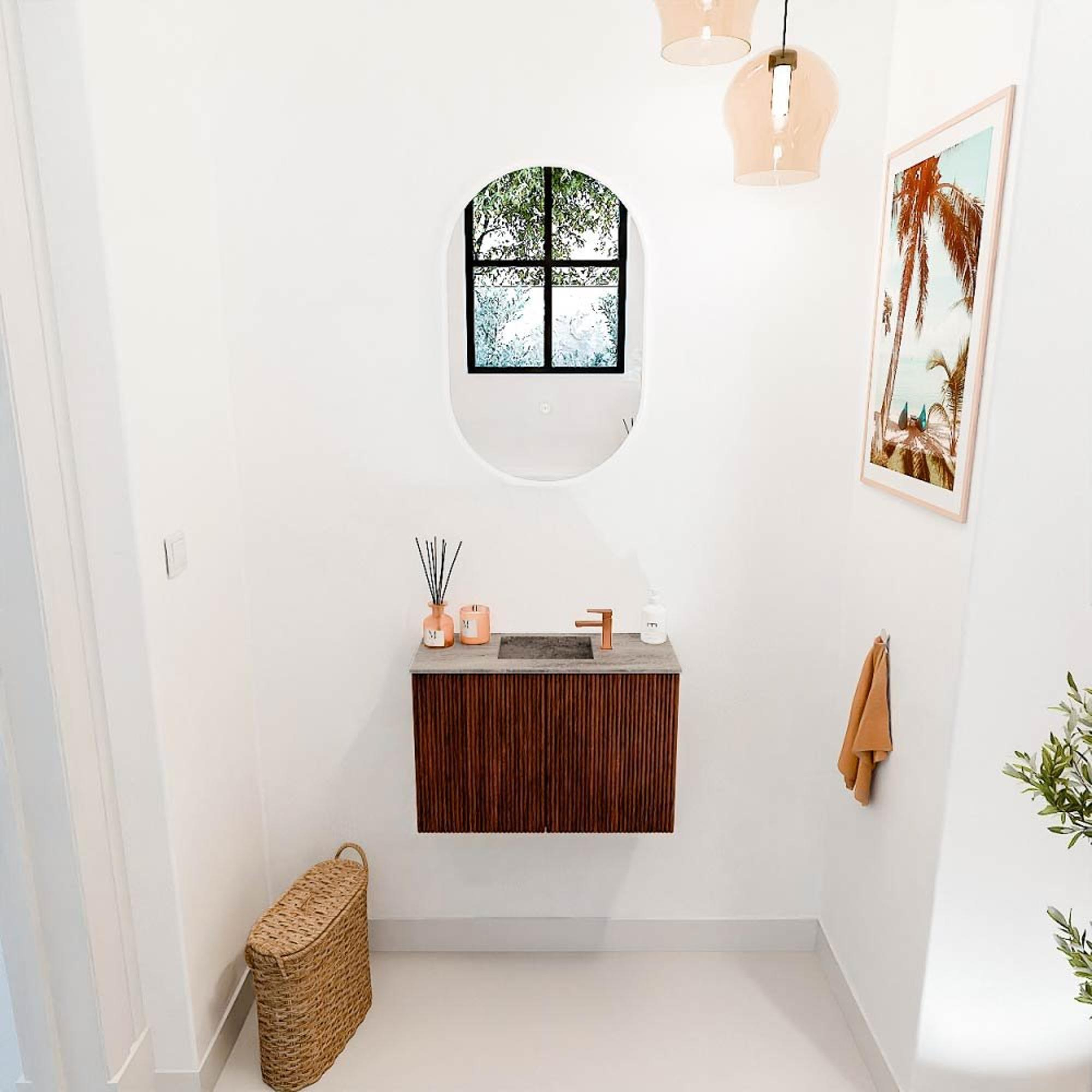 Met dit compacte en stijlvolle meubel geef je jouw badkamer of gastentoilet direct een frisse, moderne uitstraling. Het combineert een warme, robuuste houten kast met een strak vormgegeven keramische wastafel, waardoor functionaliteit en design perfect samenkomen. Dankzij het slimme formaat van 60 cm breedte en de wandmontage benut je zelfs kleine ruimtes optimaal, zonder dat het benauwd aanvoelt. De diepe, rijke Ruby-kleur van het meubel voegt een vleugje luxe toe, terwijl de wastafel in de subtiele Oza-tint een mooi contrast vormt. Zo creëer je een harmonieuze sfeer waarin je elke dag met plezier begint. Dit meubel is niet alleen een praktische oplossing voor je wasbehoefte, maar ook een echte blikvanger die jouw badkamer een persoonlijke touch geeft.