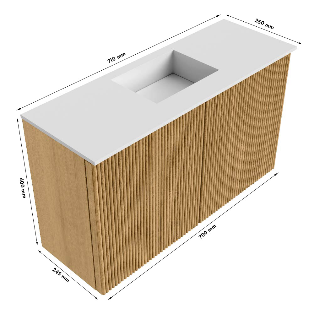 Met een breedte van 70 cm en een diepte van slechts 24,5 cm is dit meubel ideaal voor kleinere badkamers of toiletten waar ruimtebesparing belangrijk is. De wastafel is slim ontworpen met een middenpositie en zonder kraangat, zodat je zelf de kraan kunt kiezen die het beste bij jouw wensen past. Het meubel biedt voldoende opbergruimte om je badkamer netjes en overzichtelijk te houden, terwijl het toch compact blijft. Door de wandmontage oogt de ruimte bovendien ruimtelijker en makkelijker schoon te houden.