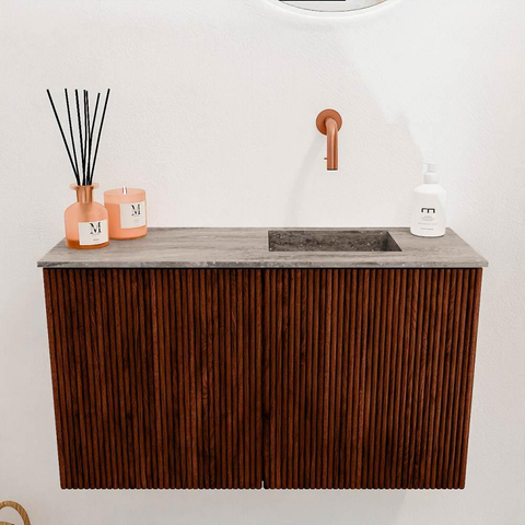 De warme Ruby-kleur van het meubel is een opvallende blikvanger die je badkamer direct karakter geeft. De fronten van massief eikenhout stralen natuurlijke klasse uit, terwijl de subtiele houtnerf zorgt voor een tijdloze uitstraling. De wastafel in de zachte Oza-grijstint sluit hier perfect op aan en maakt het geheel af met een moderne, elegante touch. Zo creëer je een badkamer die niet alleen functioneel is, maar ook een plek waar je elke dag met plezier verblijft.