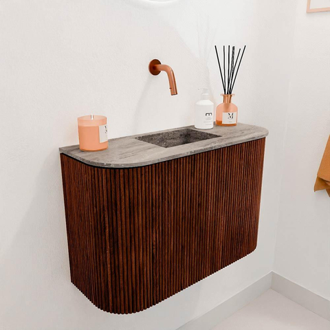 Transformeer jouw badkamer met dit prachtige meubel dat niet alleen praktisch is, maar ook een echte blikvanger vormt. Dankzij het unieke ontwerp met ronde zijden aan zowel links als rechts, krijgt jouw ruimte een zachte, uitnodigende uitstraling. De combinatie van de warme ruby kleur en de stijlvolle Oza wastafel zorgt voor een harmonieus geheel dat direct sfeer toevoegt. Dit meubel is ideaal voor wie houdt van een subtiele luxe en tegelijkertijd waarde hecht aan functionaliteit. Met zijn compacte afmetingen past het perfect in kleinere badkamers of toiletruimtes, zonder in te leveren op opbergruimte of comfort. De centraal geplaatste wastafel zonder kraangat biedt je de vrijheid om zelf de kraan te kiezen die het beste bij jouw stijl en wensen past. Zo creëer je een badkamer die helemaal van jou is, waar je elke dag met plezier begint en eindigt.