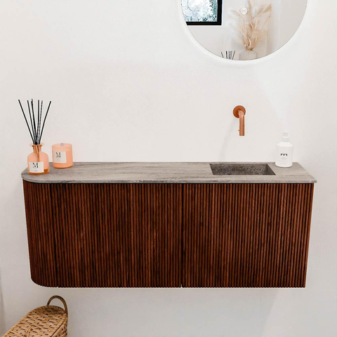 Transformeer je badkamer met dit prachtige meubel dat niet alleen functioneel is, maar ook een echte blikvanger vormt. De combinatie van warme kleuren en hoogwaardige materialen zorgt voor een stijlvolle en uitnodigende sfeer. Dankzij het slimme ontwerp met een subtiele ronding aan de linkerkant en een wastafel aan de rechterzijde, benut je de ruimte optimaal zonder in te leveren op comfort. Dit meubel brengt rust en elegantie in je badkamer, terwijl het praktische opbergruimte biedt voor al je essentials. Zo geniet je dagelijks van een georganiseerde en sfeervolle omgeving waar je met plezier je dag begint en afsluit.