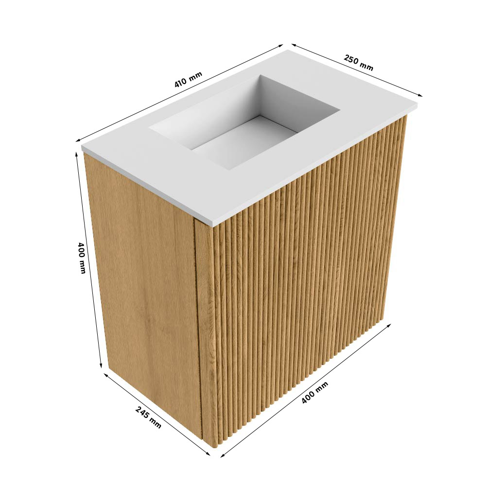 Met dit compacte meubel geef je jouw kleine badkamer of gastentoilet een stijlvolle en praktische upgrade. Dankzij het slanke formaat van 40 cm breed en de geringe diepte past het moeiteloos in elke ruimte waar je net dat beetje extra comfort en opbergruimte wilt creëren. Het meubel straalt moderne eenvoud uit, met een frisse uitstraling die direct de sfeer van je badkamer verhoogt. De combinatie van het warme Ruby-kleurige hout en de strakke, centraal geplaatste wastafel zonder kraangat zorgt voor een tijdloos design dat zich moeiteloos aanpast aan verschillende interieurstijlen. Zo geniet je niet alleen van een functionele oplossing, maar ook van een echte blikvanger die jouw badkamer compleet maakt.