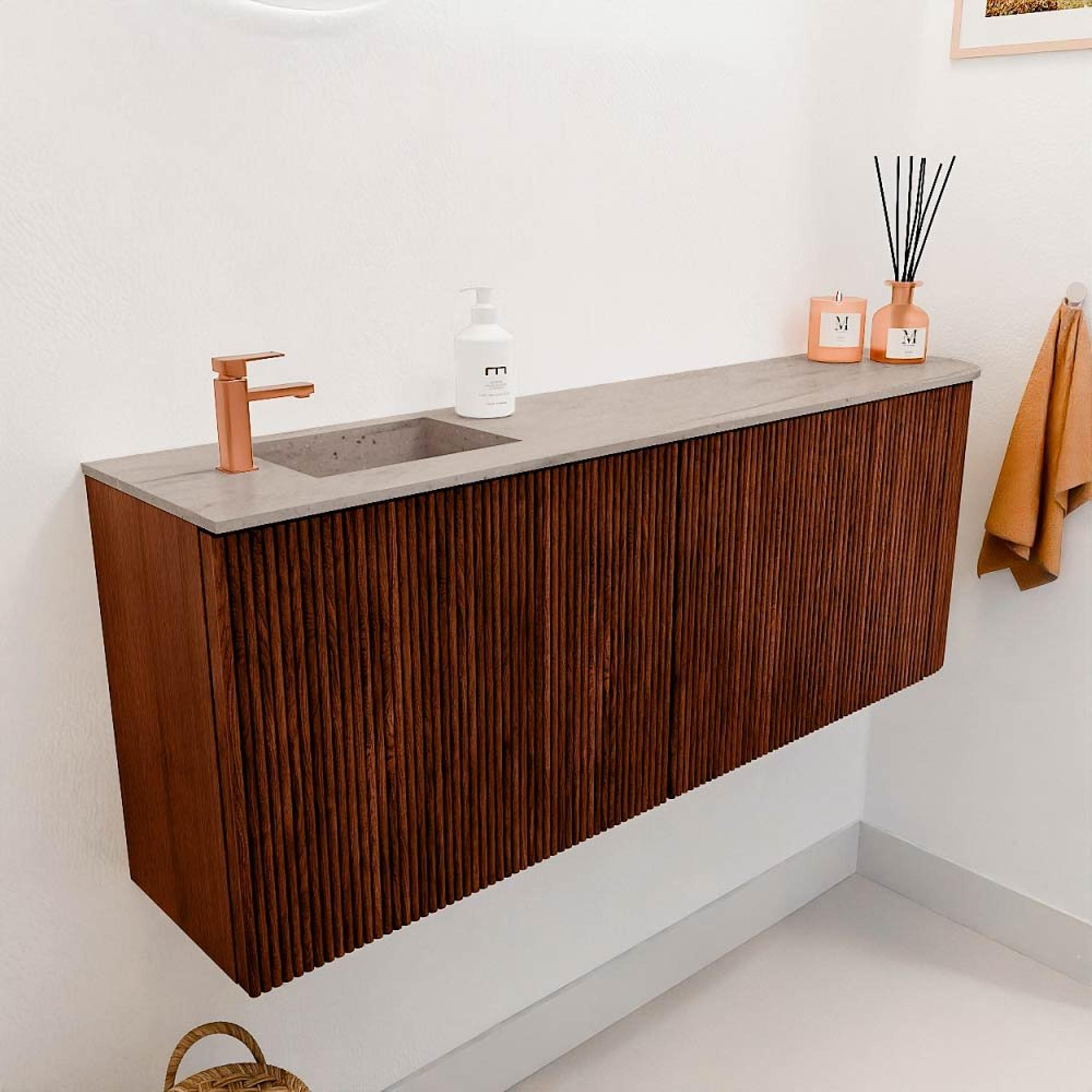 Stel je voor hoe jouw badkamer of gastentoilet een ware transformatie ondergaat met dit prachtige meubel. Het combineert een verfijnde uitstraling met slimme functionaliteit, waardoor je ruimte niet alleen mooier, maar ook praktischer wordt. Dankzij het subtiele ontwerp met een elegante ronding aan de rechterkant krijgt jouw badkamer een unieke touch die meteen opvalt. De warme Ruby-kleur geeft het meubel een karaktervolle uitstraling, terwijl de hoogwaardige materialen zorgen voor een duurzame investering waar je jarenlang plezier van hebt. Met de wastafel aan de linkerkant en een handig kraangat is het gebruiksgemak optimaal afgestemd op jouw dagelijkse ritueel. Dit meubel nodigt uit tot rust en comfort, en maakt van jouw badkamer een plek waar je je echt thuis voelt.
