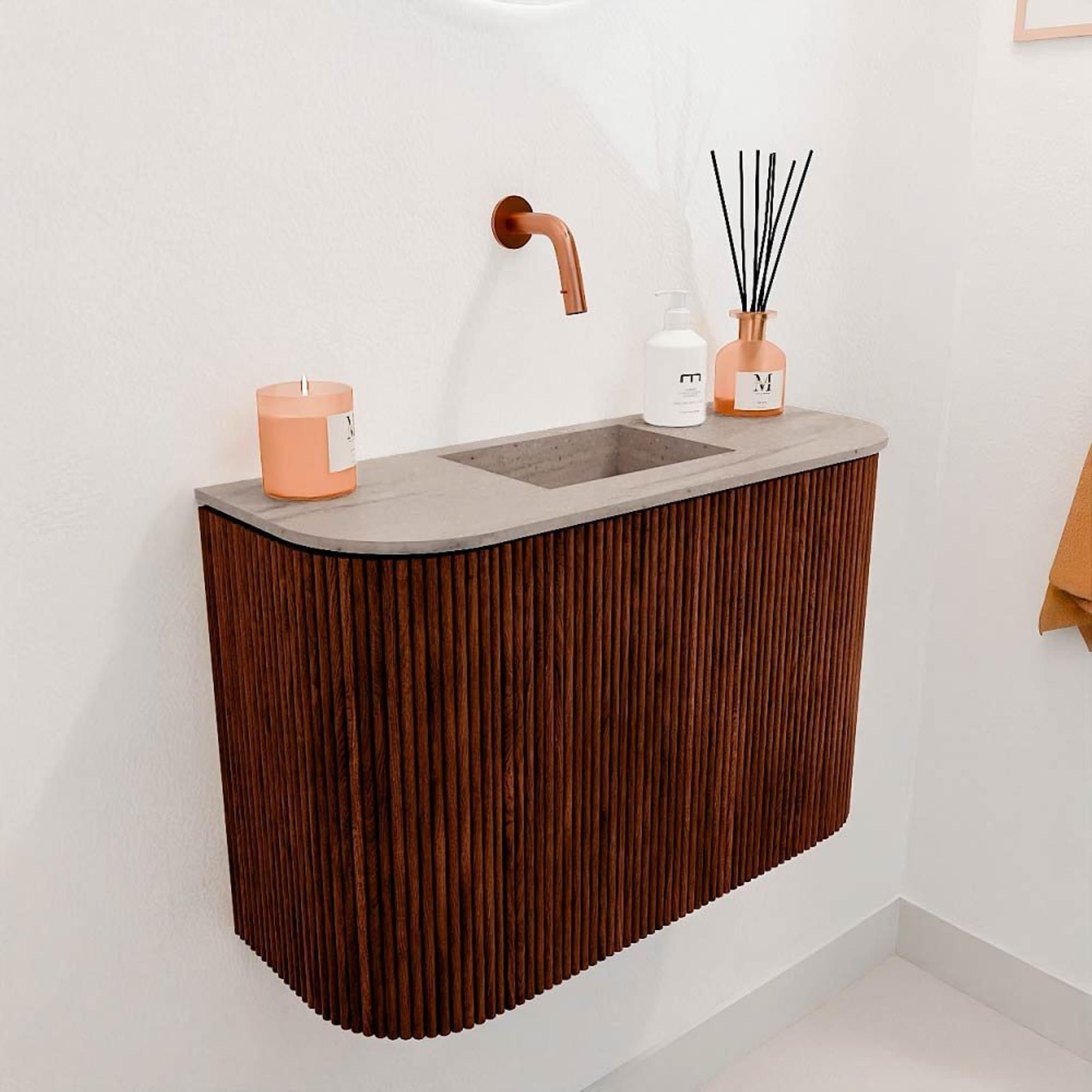 Transformeer jouw badkamer met dit prachtige meubel dat niet alleen praktisch is, maar ook een echte blikvanger vormt. Dankzij het doordachte ontwerp met elegante rondingen aan beide zijden krijgt jouw ruimte een zachte, uitnodigende uitstraling. De combinatie van warme kleuren en hoogwaardige materialen zorgt voor een tijdloze sfeer waarin je elke dag met plezier begint en eindigt. Dit meubel biedt je volop opbergruimte zonder dat het veel ruimte inneemt, waardoor het perfect is voor zowel compacte als ruime badkamers. De wastafel, centraal geplaatst en zonder kraangat, geeft je de vrijheid om zelf een kraan te kiezen die perfect bij jouw stijl past. Zo geniet je van een badkamer die precies aansluit bij jouw wensen en leefstijl.