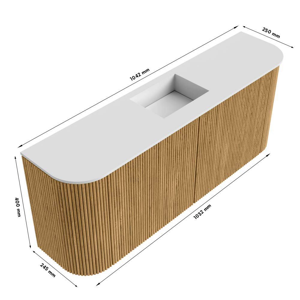 Met een breedte van 103,2 cm en een diepte van 24,5 cm biedt dit meubel voldoende opbergruimte zonder te veel ruimte in te nemen. De wandmontage zorgt voor een zwevend effect, wat niet alleen modern oogt, maar ook het schoonmaken van de vloer vergemakkelijkt. De wastafel is slim ontworpen met een centraal geplaatste positie zonder kraangat, waardoor je volledige vrijheid hebt in de keuze van jouw kraan. Dit maakt het meubel uitermate geschikt voor verschillende badkameropstellingen en persoonlijke voorkeuren. Zo geniet je van een doordacht ontwerp dat jouw dagelijkse gebruiksgemak verhoogt.