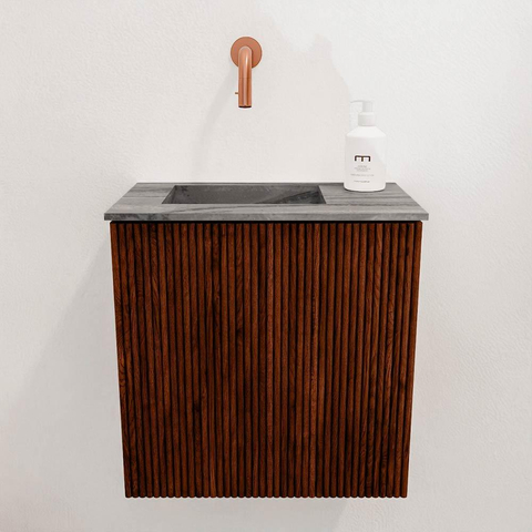 Met dit compacte en stijlvolle meubel geef je jouw toiletruimte direct een luxe uitstraling. Het combineert een verfijnde, warme kleur Ruby met een tijdloos design dat perfect past in moderne badkamers. Dankzij de wandmontage benut je de ruimte optimaal, waardoor zelfs kleine badkamers groter en luchtiger aanvoelen. De combinatie van massief eikenhout en eikenfineer met verticale ribbels zorgt voor een subtiele textuur die het meubel een unieke en hoogwaardige uitstraling geeft. De wastafel zonder kraangat maakt het geheel strak en minimalistisch, terwijl de links gepositioneerde Faye wastafel praktische gebruiksvriendelijkheid biedt. Dit meubel is niet alleen mooi, maar ook antibacterieel behandeld, wat bijdraagt aan een hygiënische en frisse badkameromgeving. Zo geniet je elke dag van een functionele en sfeervolle ruimte waar je met plezier tijd doorbrengt.