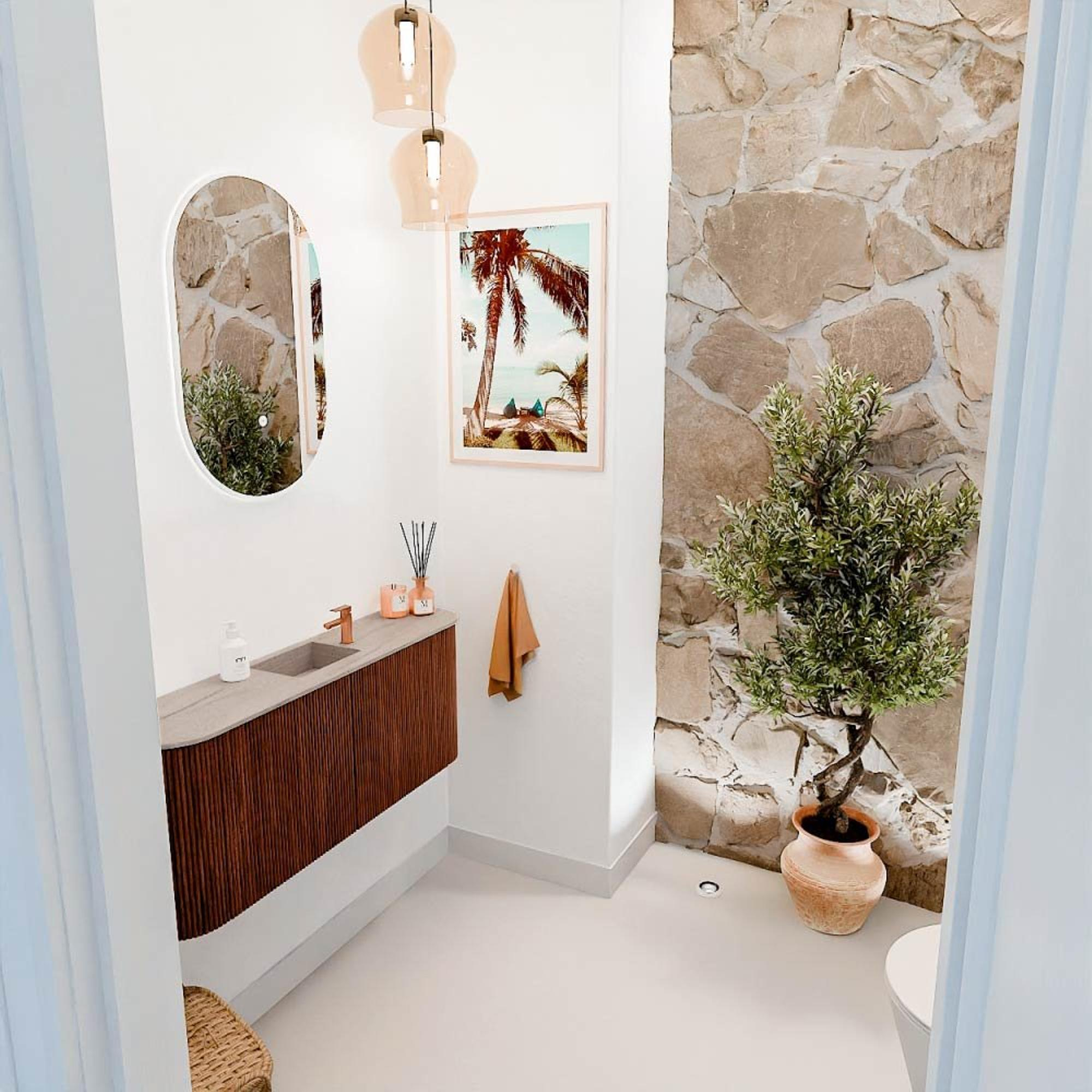 Met zijn opvallende Ruby kleur en elegante rondingen is dit meubel een echte blikvanger. De warme, diepe tint geeft je badkamer direct een luxe uitstraling zonder te schreeuwerig te zijn. De combinatie van het meubel met de beige wastafel in kleur Saba zorgt voor een harmonieus geheel dat rust en klasse uitstraalt. Door het subtiele design met zachte lijnen past het meubel zowel in moderne als klassieke badkamers. Zo voeg je moeiteloos een vleugje verfijning toe aan jouw ruimte, wat een prettige sfeer creëert waar je elke dag van geniet.