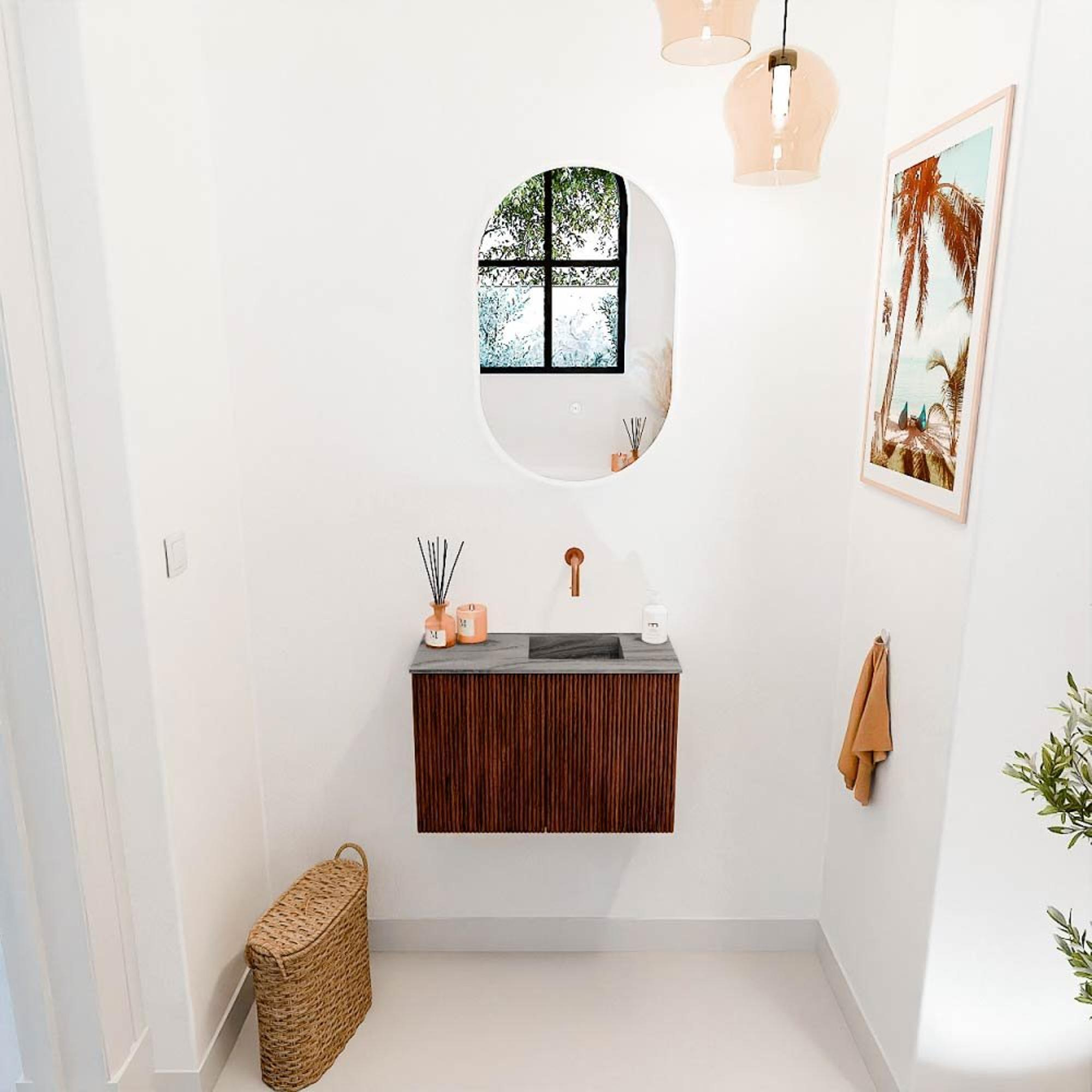 Met dit prachtige meubel geef je jouw badkamer direct een stijlvolle en moderne uitstraling. Het compacte formaat van 60 cm breed maakt het ideaal voor kleinere ruimtes, zonder in te leveren op functionaliteit. De warme kleur Ruby van het meubel combineert perfect met de subtiele, donkere tint Sombra van de wastafel, waardoor een sfeervol contrast ontstaat dat je badkamer een luxe en eigentijdse uitstraling geeft. Dankzij de doordachte indeling met twee deuren creëer je voldoende opbergruimte om je badkamer netjes en overzichtelijk te houden. Het meubel nodigt uit tot een georganiseerde en rustgevende omgeving, waar je elke dag met plezier begint en eindigt. Bovendien zorgt de hoogwaardige afwerking en het gebruik van duurzame materialen ervoor dat je jarenlang kunt genieten van deze aanwinst.