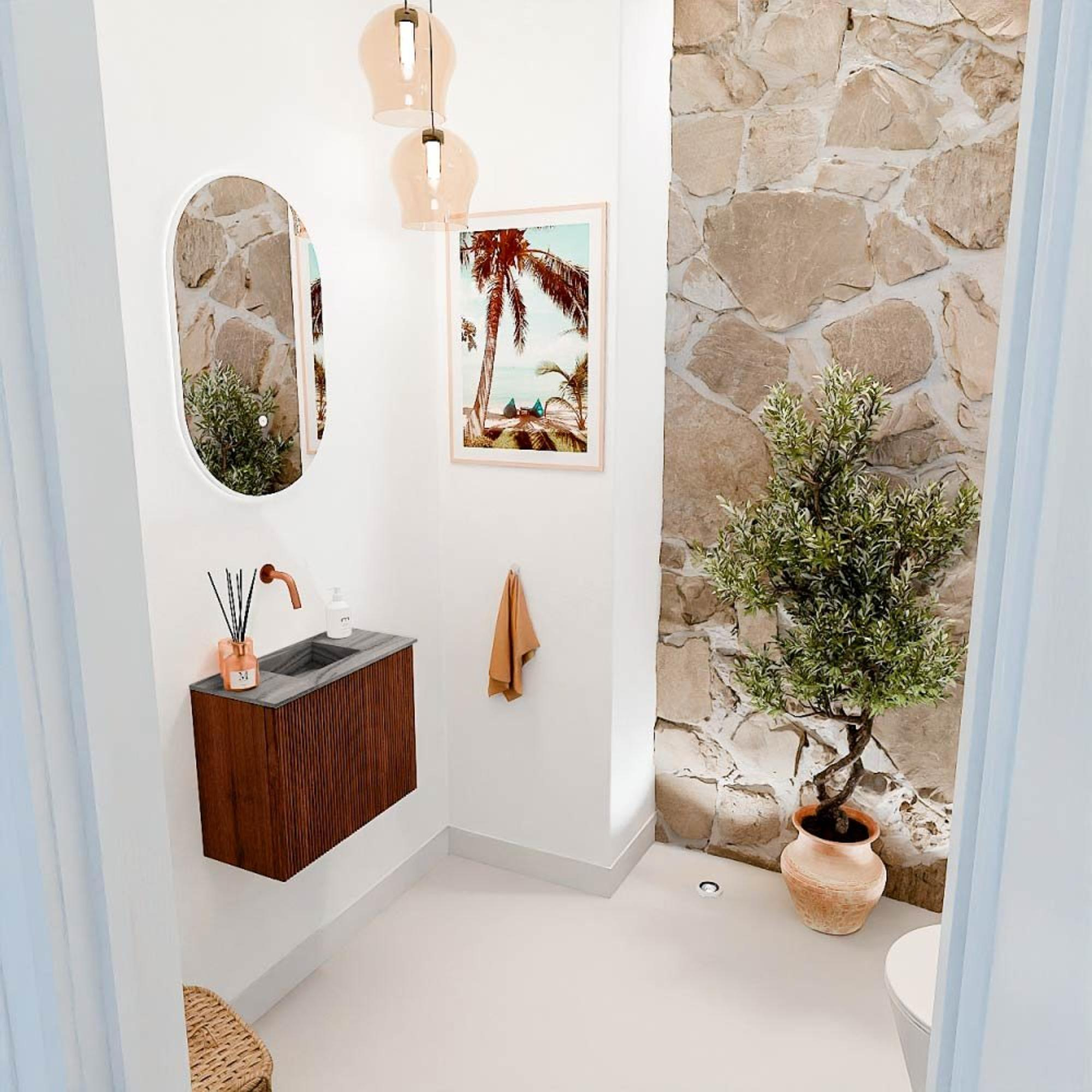 Met dit compacte en stijlvolle meubel geef je jouw badkamer of toiletruimte direct een warme en luxe uitstraling. Het meubel combineert een prachtig houten kastje in een opvallende Ruby kleur met een strak vormgegeven wastafel in de kleur Sombra. Dankzij het slimme formaat van 50 cm breed past het perfect in kleinere ruimtes, zonder dat je inlevert op functionaliteit of design. De wastafel is centraal geplaatst en zonder kraangat, zodat je zelf de kraan kunt kiezen die het beste bij jouw stijl en wensen past. Dit meubel biedt niet alleen een mooie plek om je badkameraccessoires netjes op te bergen, maar zorgt ook voor een georganiseerde en frisse uitstraling. Zo transformeer je jouw badkamer moeiteloos tot een plek waar je elke dag met plezier begint en eindigt.
