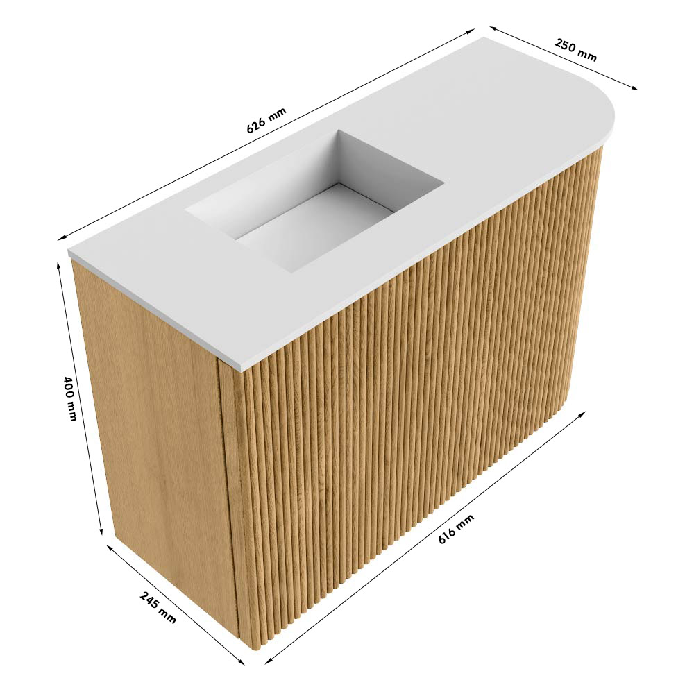 Met dit prachtige meubel geef je jouw toilet een stijlvolle en warme uitstraling die direct opvalt. Het compacte formaat van 61,6 cm breed past perfect in kleinere ruimtes, zonder in te leveren op functionaliteit. De combinatie van een robuuste, massief eikenhouten voorkant en de subtiele ronding aan de rechterzijde zorgt voor een elegant en eigentijds design. De wastafel, gemaakt van hoogwaardig solid surface materiaal, ligt aan de linkerkant en is voorzien van een kraangat, zodat je eenvoudig jouw favoriete kraan kunt plaatsen. Dankzij de verticale ribbels in het hout krijgt het meubel een speels en toch verfijnd karakter. Dit meubel is niet alleen een lust voor het oog, maar ook praktisch in gebruik en eenvoudig te onderhouden. Zo transformeer je jouw toilet in een plek waar je met plezier tijd doorbrengt.