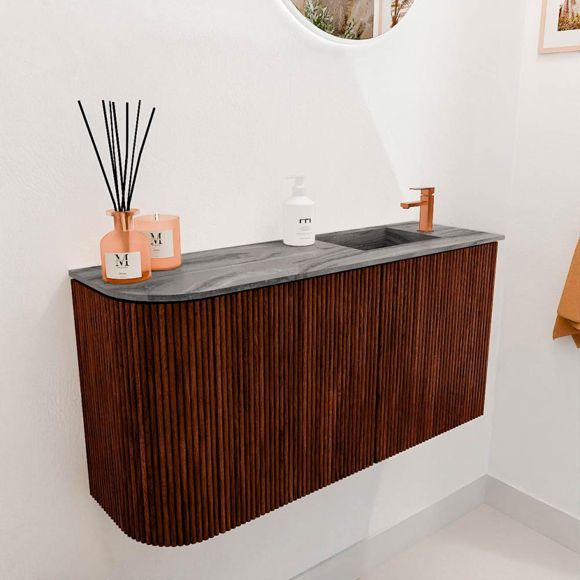 - Faye wastafel in de kleur Sombra, rechts geplaatst met één kraangat