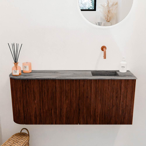 Het meubel valt direct op door zijn elegante uitstraling. De diepe Ruby kleur geeft een warme, luxe sfeer aan je badkamer, terwijl de verticale ribbelstructuur subtiel diepte en karakter toevoegt. Deze combinatie zorgt voor een tijdloos design dat moeiteloos aansluit bij verschillende interieurstijlen, van modern tot klassiek. Zo geniet je niet alleen van een functioneel meubel, maar ook van een echte blikvanger die jouw badkamer een unieke uitstraling geeft.