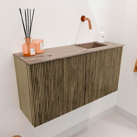 De combinatie van de diepe, natuurlijke kleur Dusk met de lichte Arena wastafel zorgt voor een elegant contrast dat direct de aandacht trekt. Dit meubel is ontworpen met oog voor detail en past moeiteloos in zowel moderne als klassieke interieurs. De strakke lijnen en het subtiele houtnerfpatroon geven jouw badkamer een warme en uitnodigende sfeer. Door de rechter positie van de wastafel ontstaat er extra werkruimte aan de linkerkant, wat het gebruiksgemak verhoogt. Zo geniet je van een stijlvol meubel dat jouw badkamer een luxe uitstraling geeft zonder te overheersen.