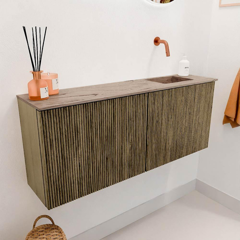 Met dit prachtige meubel geef je jouw toiletruimte direct een stijlvolle en functionele upgrade. Het combineert een tijdloos design met praktische eigenschappen, waardoor het niet alleen mooi oogt, maar ook perfect aansluit op jouw dagelijkse gebruik. De warme kleur Dusk in combinatie met de elegante Arena wastafel zorgt voor een rustige en uitnodigende sfeer. Dankzij het geraamte van melamine en de hoogwaardige afwerking met massief eikenhout en eikenfineer, ervaar je een meubel dat duurzaam is en lang meegaat. De subtiele verticale ribbels voegen een verfijnde textuur toe, waardoor het meubel een luxe uitstraling krijgt zonder te overheersen. Dit meubel maakt van jouw toilet een plek waar je met plezier even tot rust komt, terwijl je profiteert van slimme details die het gebruiksgemak verhogen.
