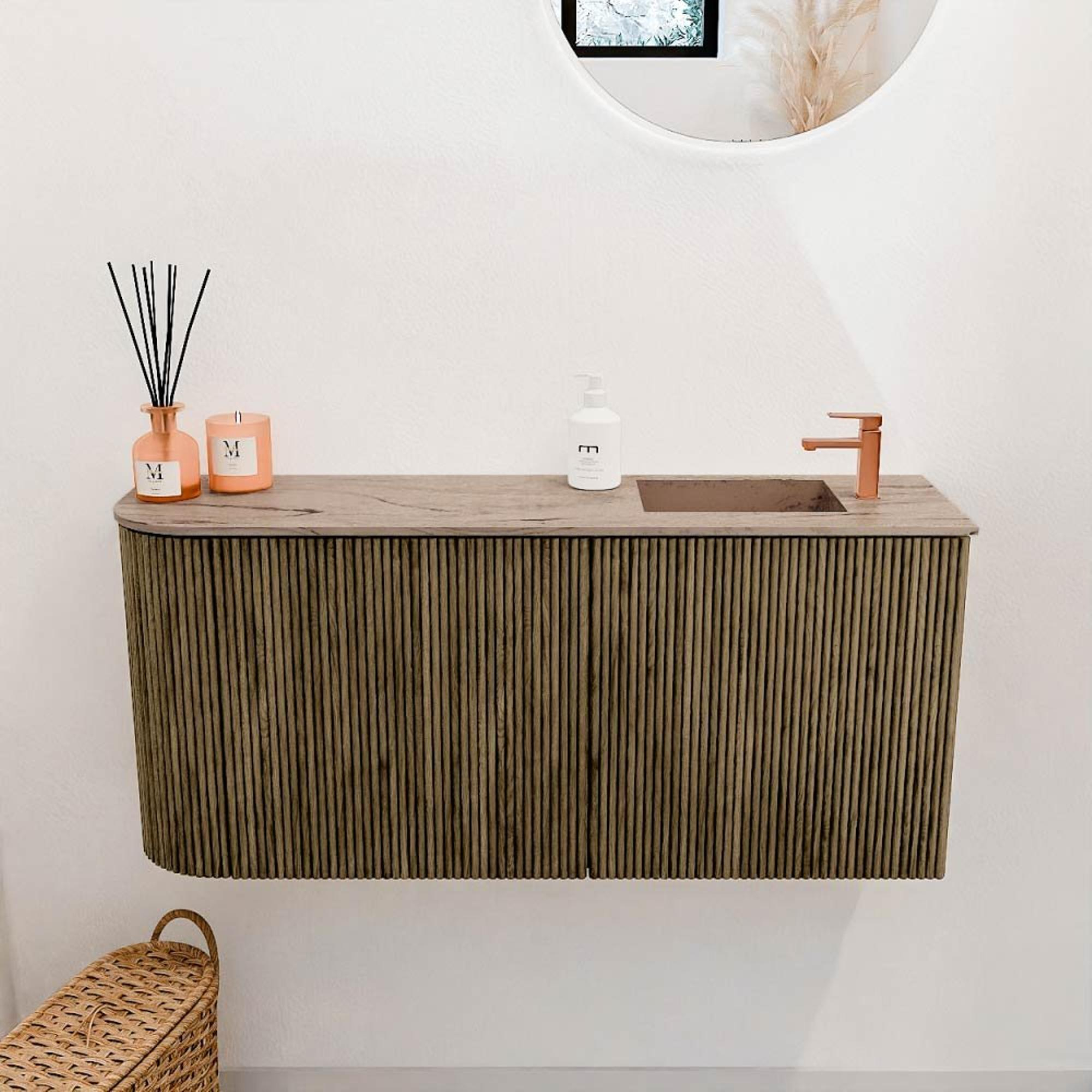 De combinatie van massief eiken en eiken fineer geeft dit meubel een luxe uitstraling die je direct opvalt. De verticale groeven en de afgeronde linkerzijde zorgen voor een uniek design dat zowel modern als tijdloos is. Door de warme kleur Dusk krijgt jouw badkamer een natuurlijke en uitnodigende sfeer. Dit meubel is een echte blikvanger die moeiteloos past bij diverse interieurstijlen, van klassiek tot eigentijds. Zo geniet je van een badkamer die niet alleen functioneel is, maar ook stijlvol en persoonlijk aanvoelt.